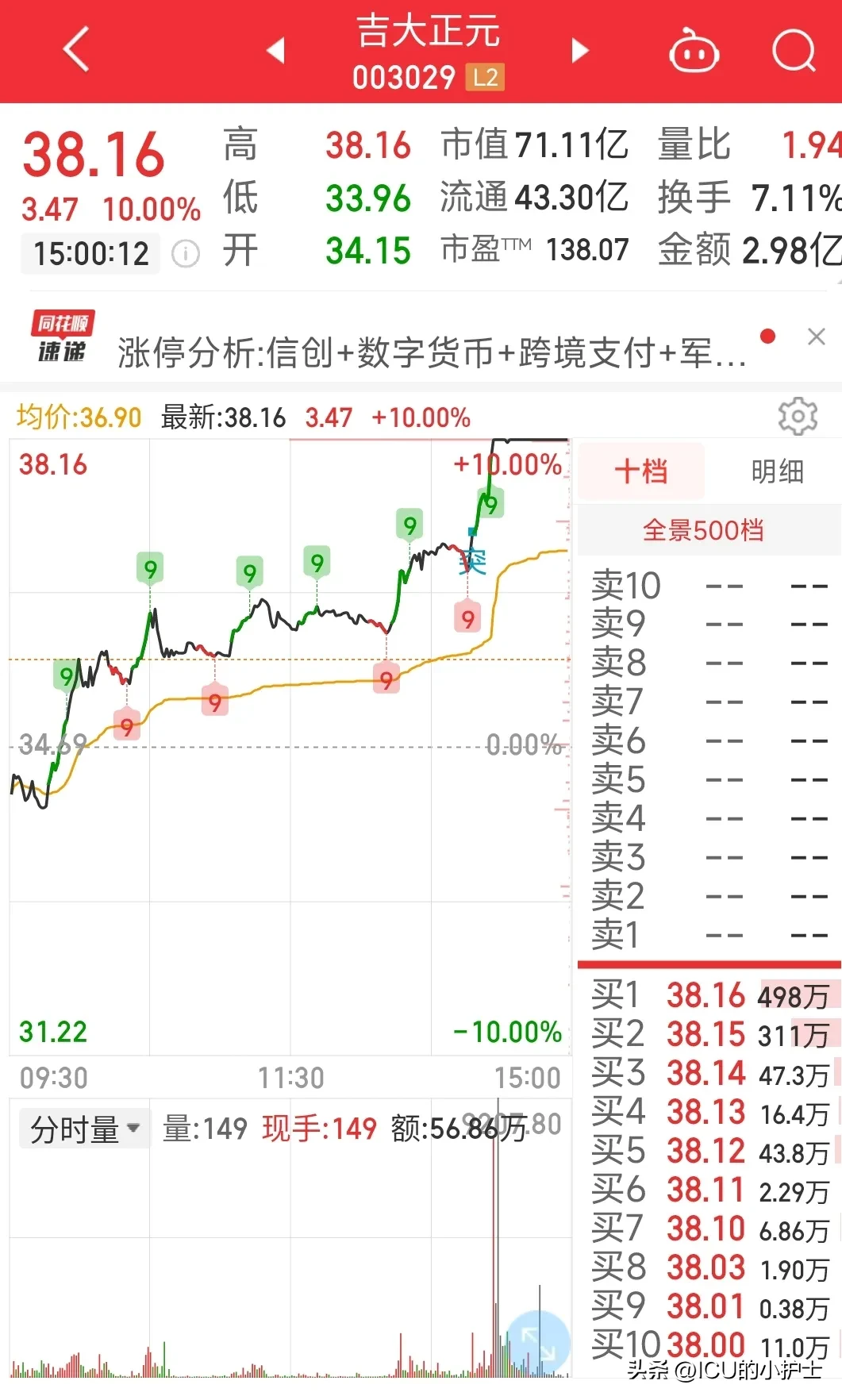 1.1万元入市,挑战每月收益10%!第12天! 吉大,终于迎来了久违的10cm,但是封板路还是有一点坎坷,距离我开始持股的预期也相差甚远!因为这两天跌的有点厉害了,现在即使封板,也还没有突破上方的38.50。