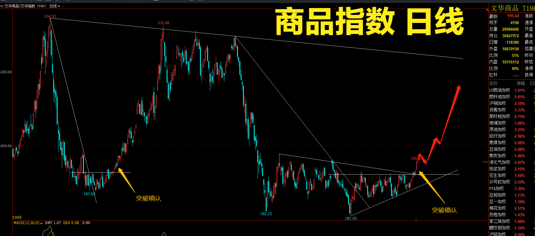 1.【期货共石油齐飞,兔年看多头登天】今日又是红彤彤的一片,日线收盘后,文华商品指数显示,阳线收官一举突破了关键压力位,今天的收线意义重大,预示着春节后,期货行情会迎来一波长期多头趋势走势。