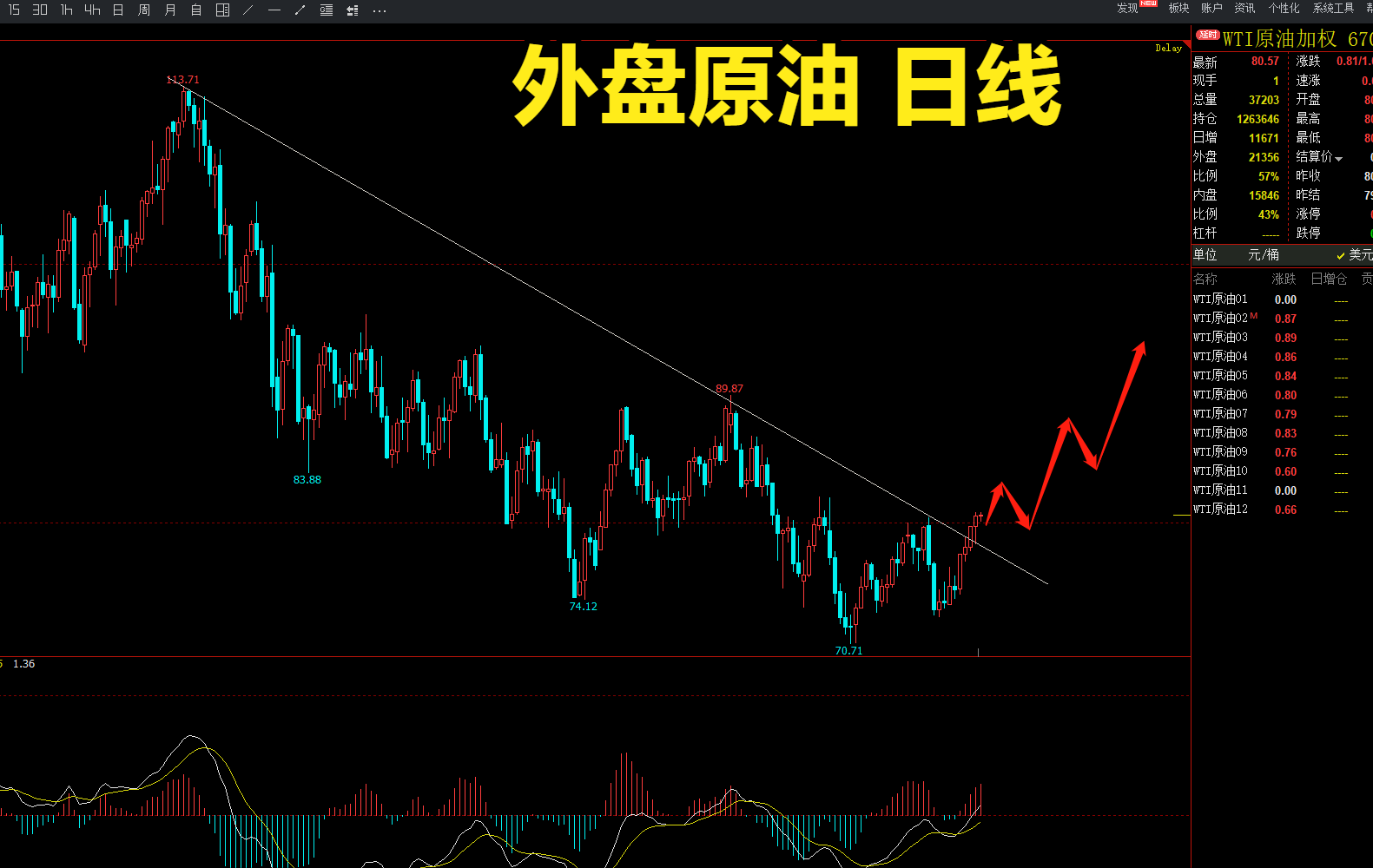 5.外盘原油日线——原油的日线也下跌了大半年,从原油的日线图来看,下跌趋势也要走出来了,后市同样都是看涨的格局。