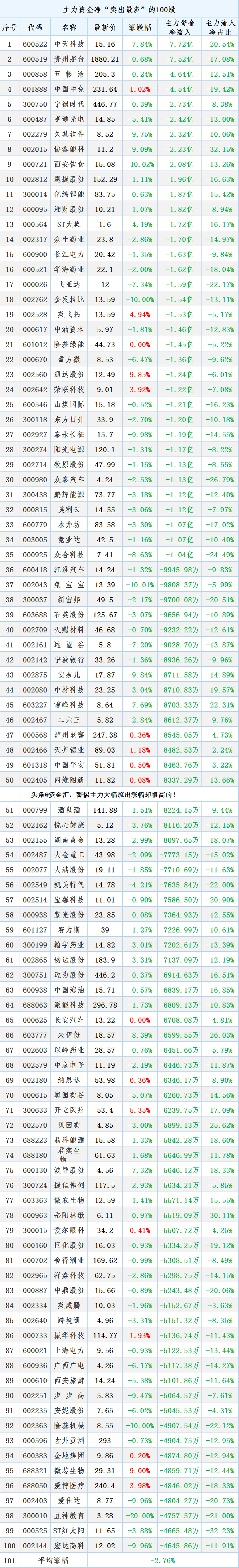 不做“接盘侠”,今日主力资金“大幅卖出”100股名单: