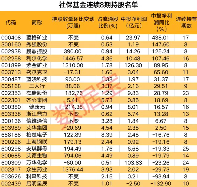 5.持仓变动来看,22只连续重仓股中,二季度末社保基金持股数量环比增加的有11只,利尔化学、众生药业、紫金矿业均获得超千万股的增持。