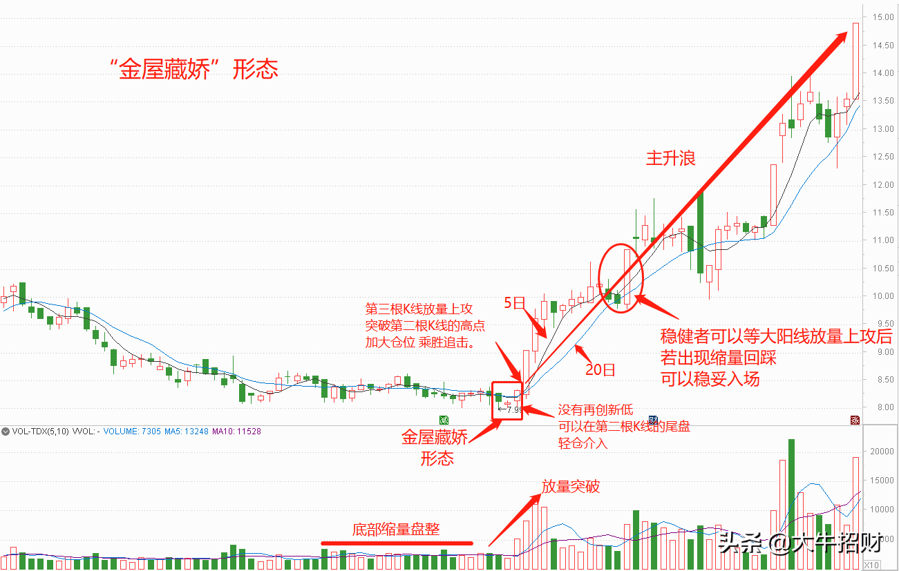 1.如果你未来几年还没打算离开股市,请将“金屋藏娇”K线形态熟记于心!无论你是股市新手,还是老股民,掌握这形态,炒股抄底是信手拈来!一、什么是“金屋藏娇”形态?个股在连续调整后,某日底部收出一根长下影K线,调整逐渐收缓脚步。