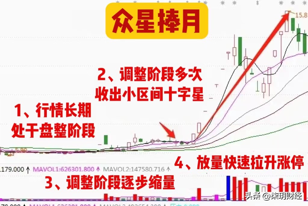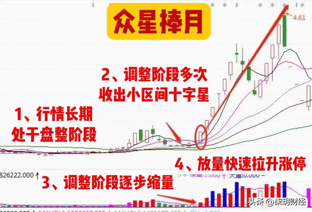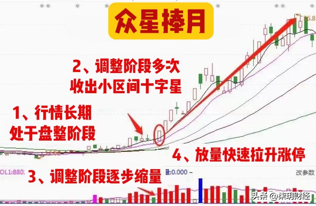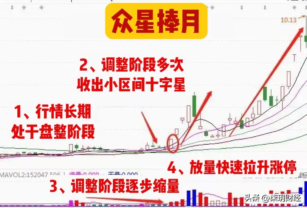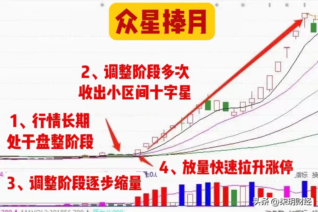12.以上便是“众星捧月”形态具体所需要的细节条件,这里给大家补充两个小细节,一是股价在前期盘整区间,个股各均线越粘合越好,整个盘整周期越长越好;二是调整阶段,K线收出的十字星越多 越好。