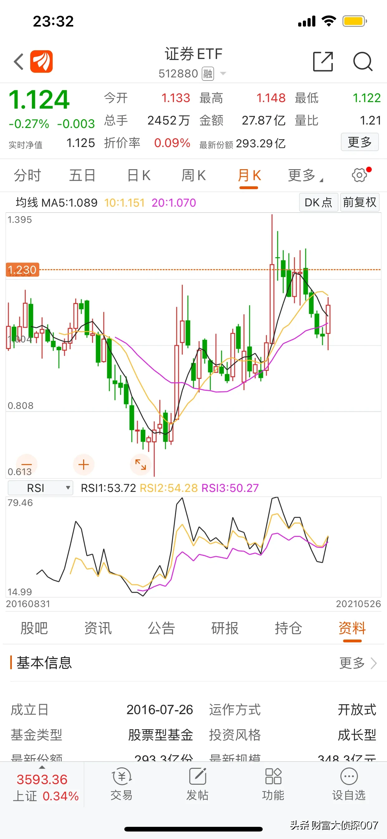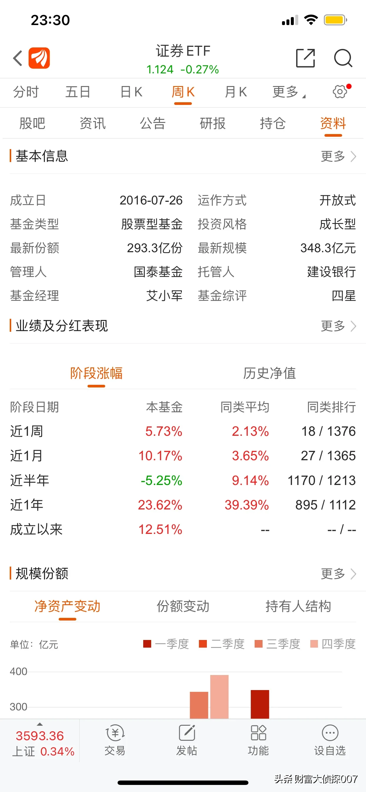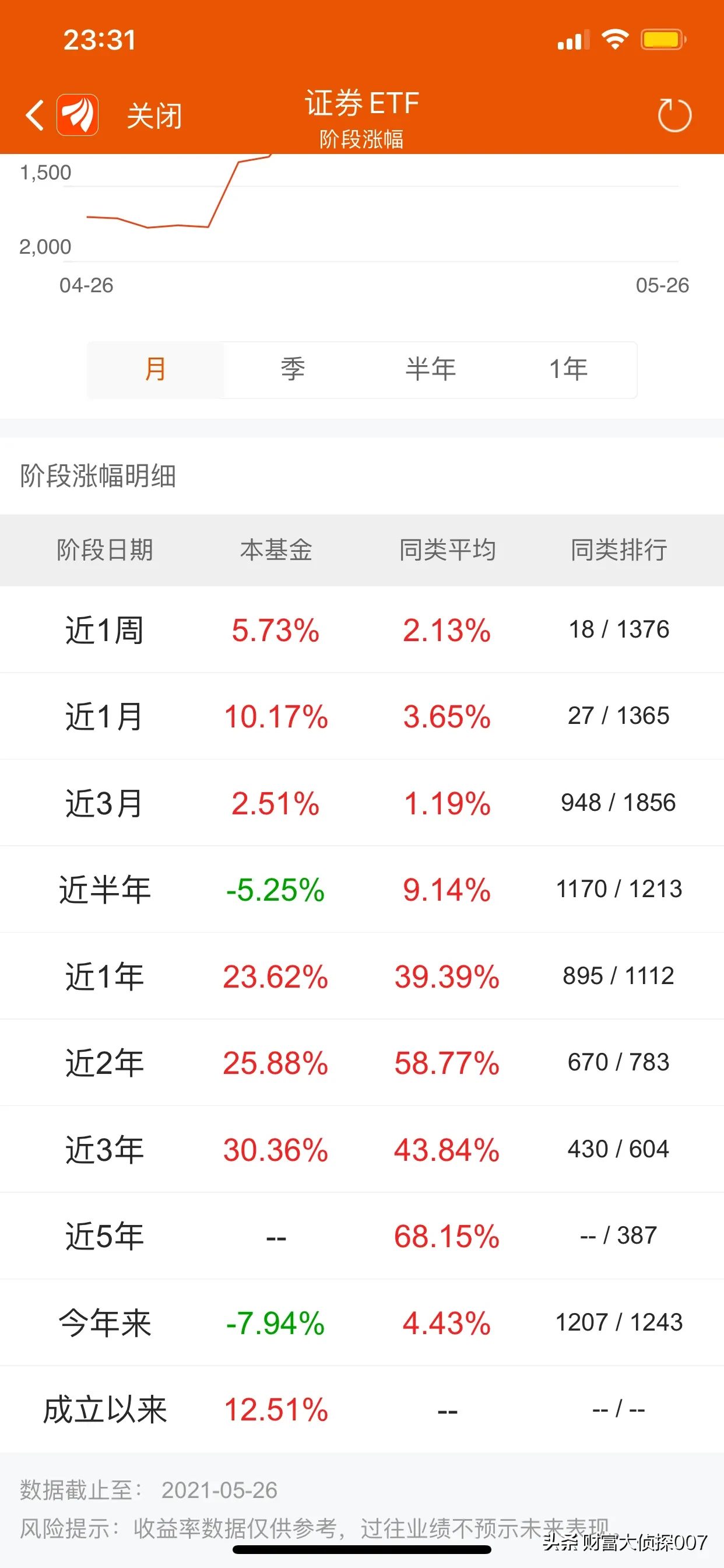 2.这个产品2016年7月26日成立的,距今也有快5年了!但是成立以来收益率只有12.51%[捂脸][捂脸][捂脸]其实侦探哥也持有证券ETF,就是国泰基金这个[捂脸][捂脸]去年买的,最近这段时间涨了不少,目前还亏接近9%…买了一年了,之前还各种补仓[捂脸][捂脸]说出来全是辛酸泪[我想静静][我想静静][泣不成声][泣不成声]要是能回本,扔出去这辈子就别碰了[泣不成声][泣不成声]这个证券ETF一直以来就是各种上串下跳,涨的急,跌的狠!看他周K先和月K线,能让人气死[我想静静][我想静静]适合做小波段,长期持有啥的,还是别了,想尝试被套牢的滋味吗?可以来试试[泣不成声][泣不成声]不得不说最近涨得不错,近期的排名简直就是上天。