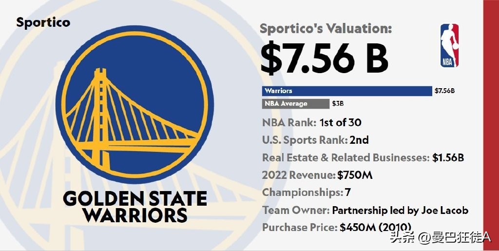 5.有很多人说是拉科布运气好,因为拉科布在收购勇士之前,这支球队的市值仅为1.88亿美元,排名联盟倒数第二。