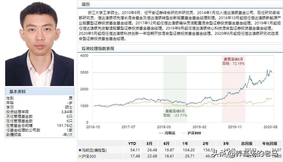 7.25、信达澳银:冯明远,风格:科技小盘一己之力撑起信达澳银,偏好小盘成长股,持仓极度分散,前十大重仓股比例仅为22.08%,一个用业绩说话的人,管理的信达澳银新能源16年任职以来累计回报237.34%。