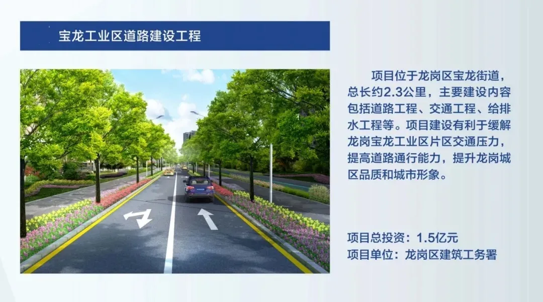 龙岗将加快民生事业高质量发展,按照“三年工程两年完成”的要求,全力推进道路交通、教育医疗、文化体育、住房保障等公共设施建设,加快实现“民生七优”;全面落实“山海连城、绿美深圳”建设部署,加快公园、绿道、碧道等建设,为企业发展和市民生活营造更具魅力的城区环境。