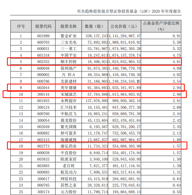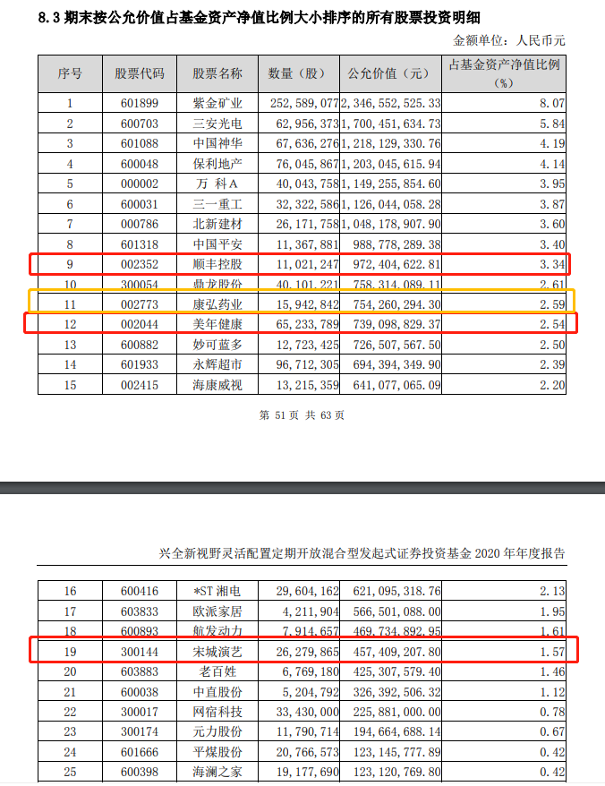 1.董承非重仓个股纷纷闪崩,是谁在定向爆破谁?根据2020年报,董老师在管的两只基金兴全新视野和兴全趋势投资,共持有顺丰控股、美年健康、康弘药业、宋城演艺的公允价值分别为25.96亿元、17.74亿元、13.09亿元、14.71亿元。