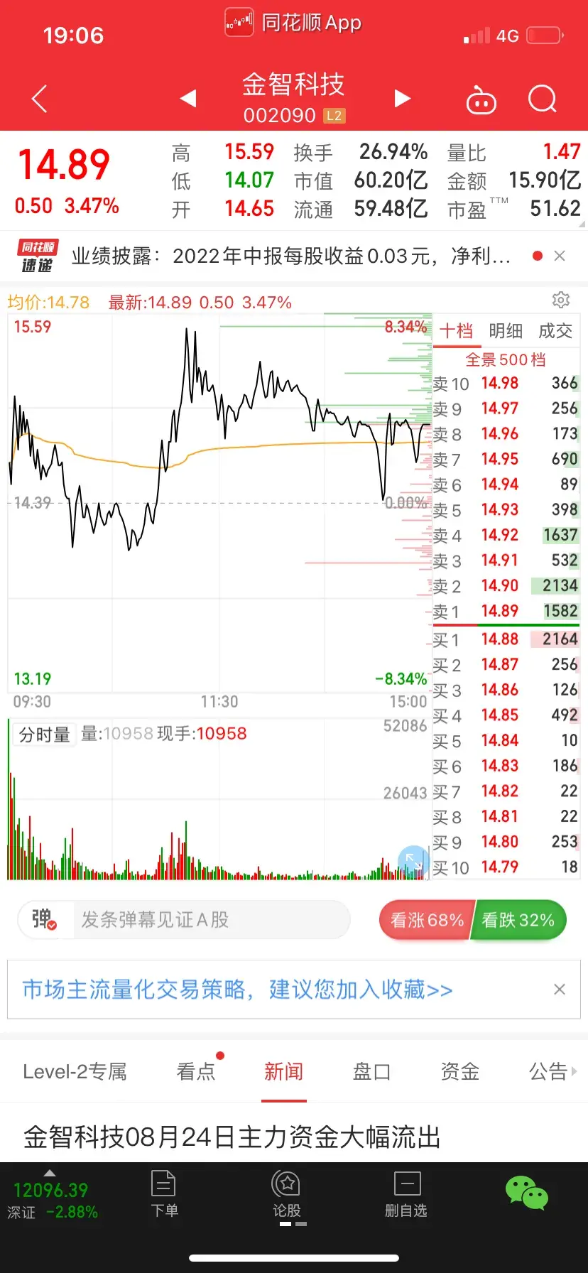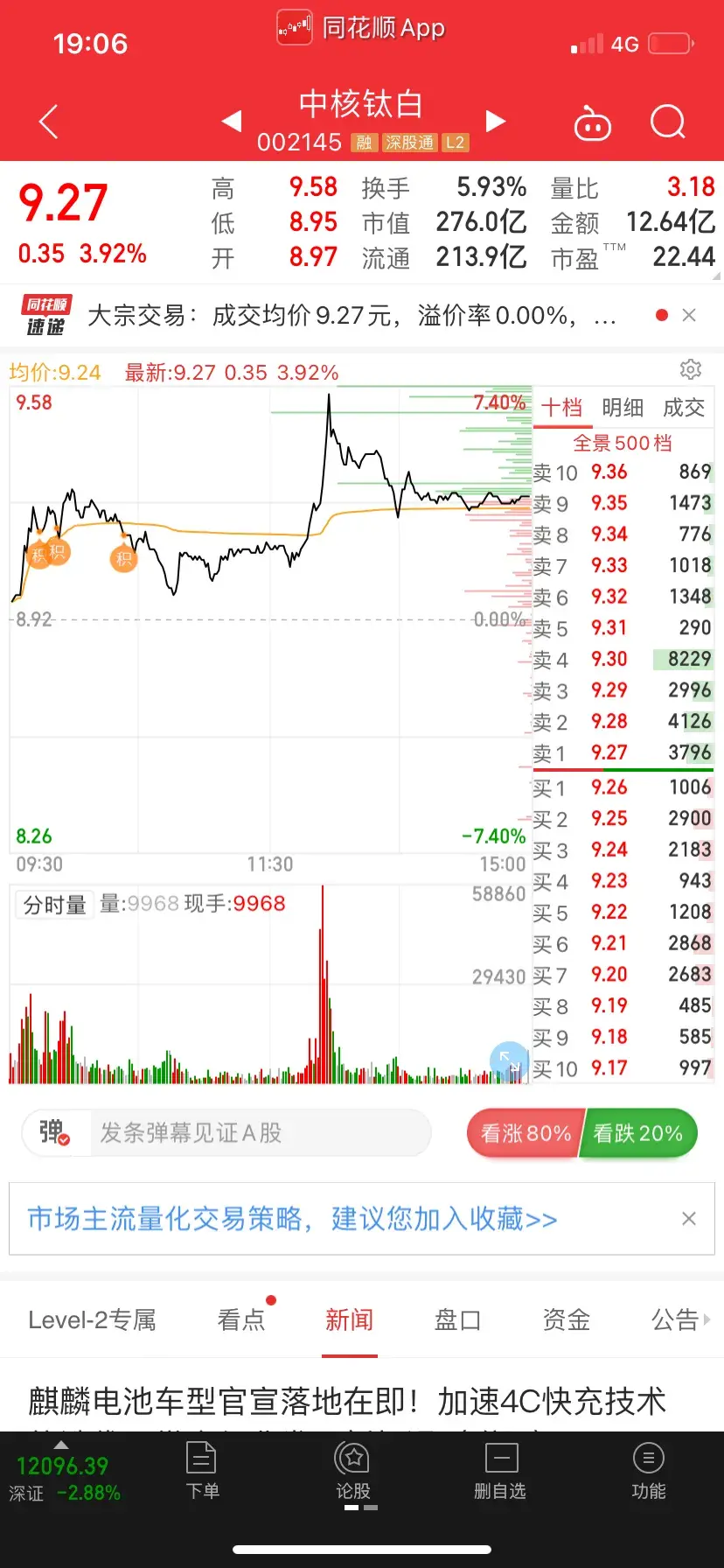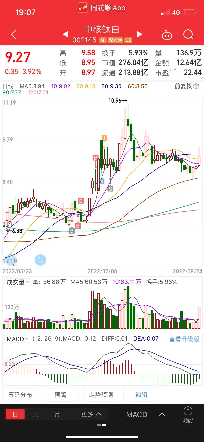 4.说说自己的操作,今天亏钱在所难免,但早盘买入了中*钛白和金*科技,算是操作的亮点,钛白属于回调站稳进去上升通道的状态,金*科技也是类似,盘中主力一度拉升超过7个点,到抛压阻力太大,最终功亏一篑!最后,每次大跌都意味着新的机会,所以别怂,别悲观;目前的行情热门赛道的个股就是1-2天的行情,所以,有赚个5个,8个点就要坚持或者清仓,以做短线为主;周期性资源股,可以做做中线,比如,磷化工,锂矿硅料,钒钛概念等。