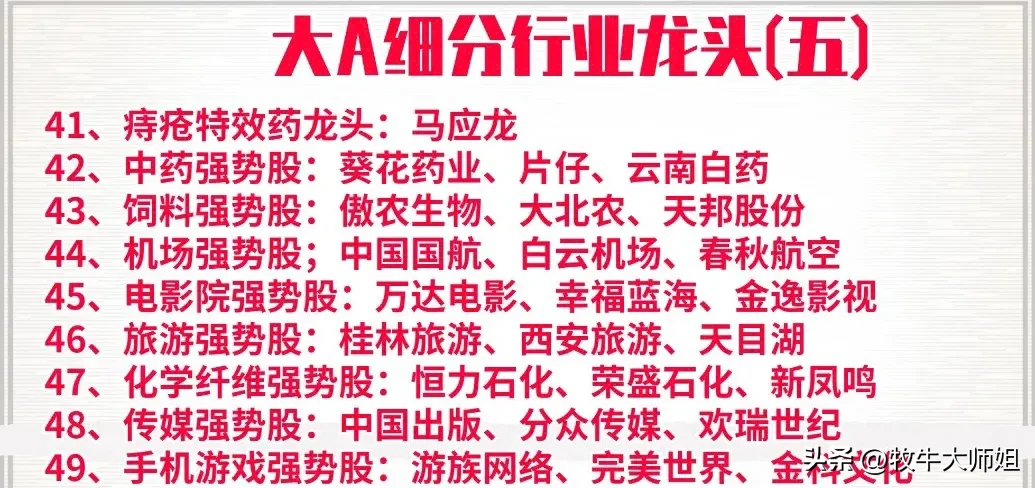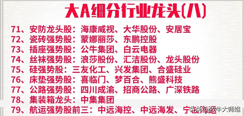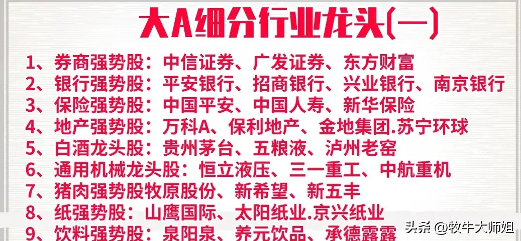 1.刚刚花了四个小时,把各个行业的龙头企业全部整理出来,这些公司都是各行各业的佼佼者,长期来看具备护城河效应,它们拥有广阔的发展全景,被消费者熟知和追捧,深受投资者的喜爱,现在我把它们全部分享出来,供大家参考研究。