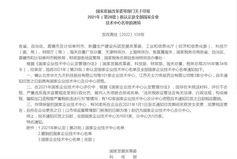 国家企业技术中心是国家发改委牵头认定,技术创新能力强,研究开发与创新水平在同行业中处于领先地位,拥有自主知识产权核心技术,具有国际竞争力的企业技术中心。该资质是目前国内规格最高、影响力最大的技术创新平台之一。