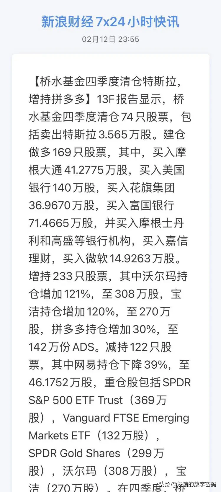 桥水基金最近公布了最新持仓,卖出了3.35万股特斯拉