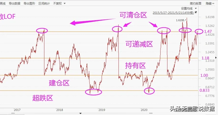 6.看看图二中的白酒指数基金各大区域划线,目前白酒基金的净值(不复权)线已经进入了我设置的可清仓区域,意思是如果你不贪,可以收手了,后面的鱼尾巴就不去吃了。