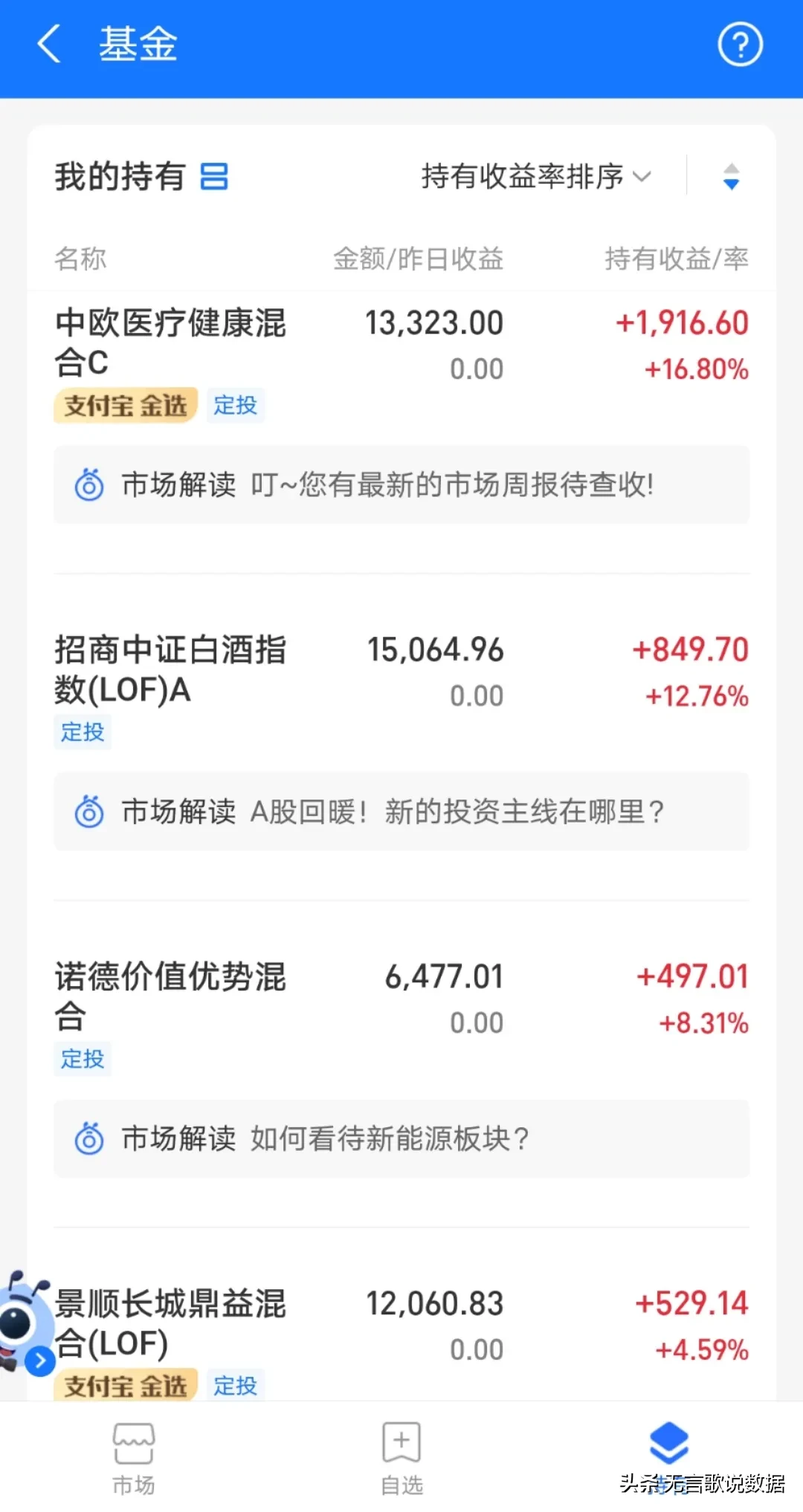 2.是继续拿着还是撤退?先看咱这小号持仓基金数据:1.中欧医疗健康混合C:收益率16.8%;2.招商中证白酒指数:收益率12.76%;3.诺德价值优势混合:收益率8.31%;4.景顺长城鼎益混合:收益率4.59%;5.兴全合润混合:收益率0.79%。