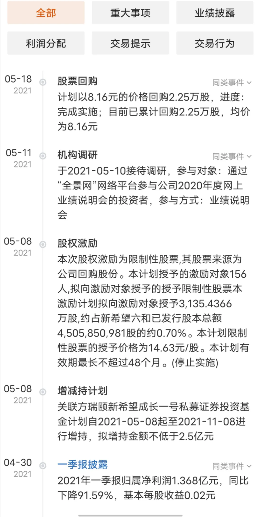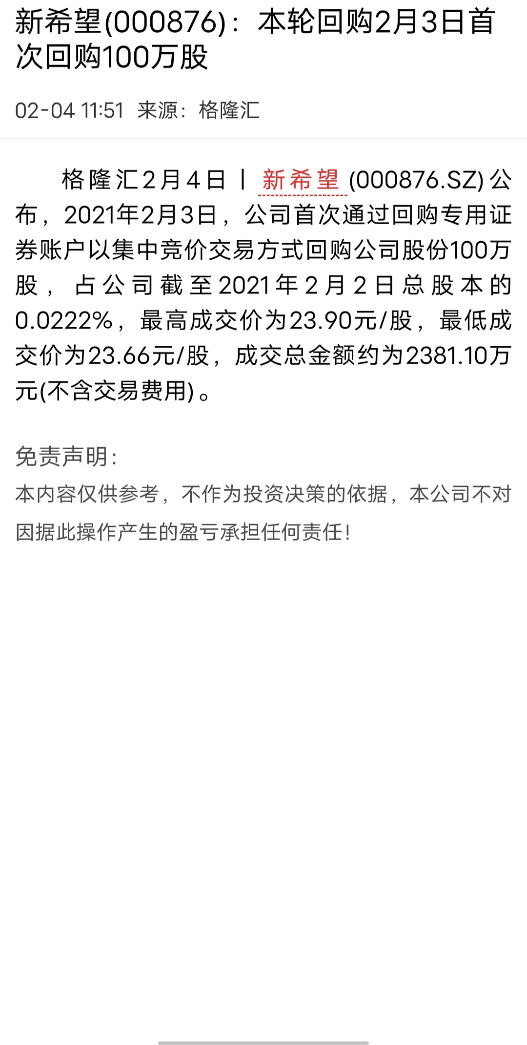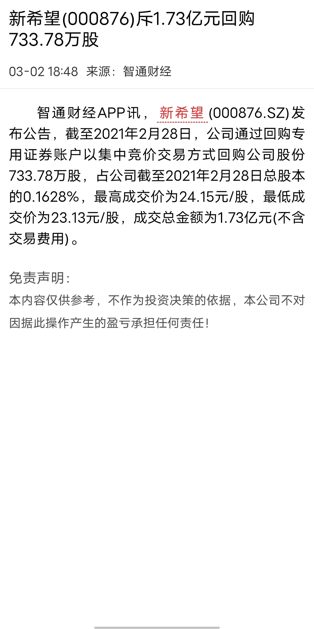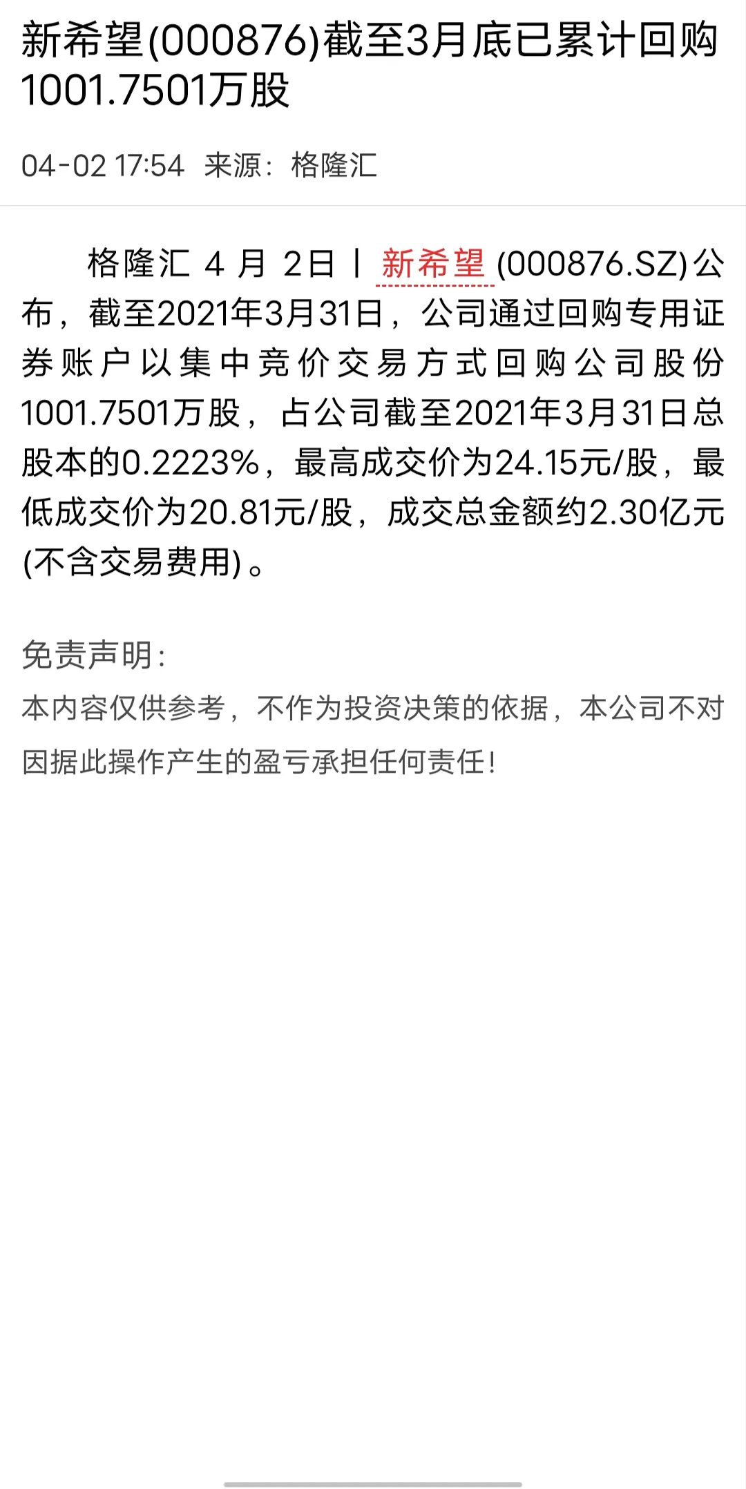 2.最高成交价格是13.70元/股最低价格为13.50元/股成交总金额3005.63万元(不含交易费用)占公司总股本的0.07%(总股本为31.47亿股)第二家公司就比较有意思新希望最近回购自己公司的股票非常频繁在2月份,3月份都回购了自己公司的股票2月份回购2381.10万(不含交易费用)总股本的0.0222%最高成交价是23.90元最低成交价是23.66元3月份回购1.73亿元(不含交易费用)总股本的0.1628%最高成交价是24.15元最低成交价是23.13元3月31日前回购2.30亿元(不含交易费用)总股本的0.2223%最好成交价是24.15元最低成交价是20.81元新希望是每个月回购的金额越来越大从第一次的2千多万到第二个月的1.7亿再到4月份的2.3亿但是股价却是一路向下,根本没有要停下来的迹象。
