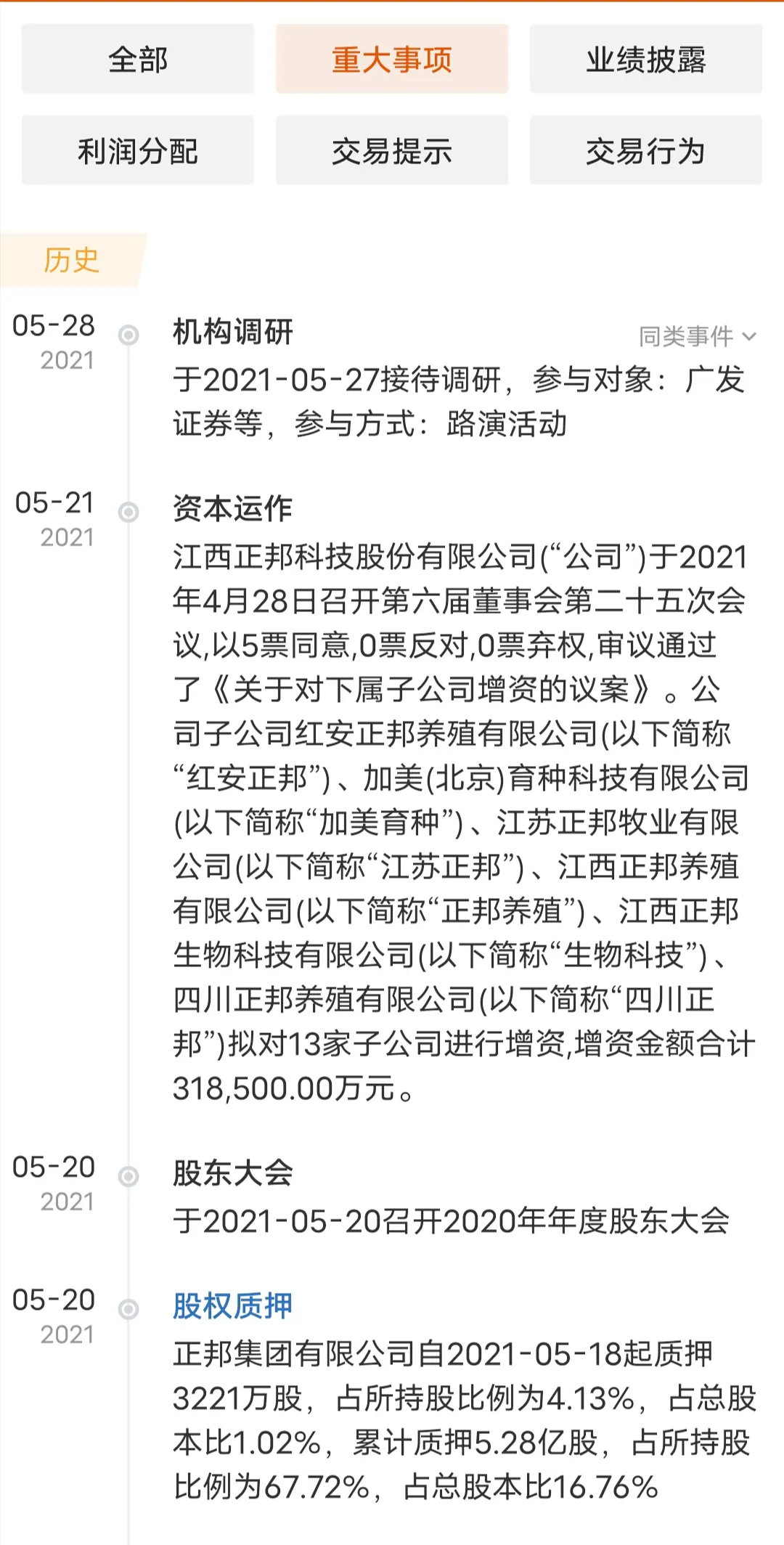 1.最近几个月份两家生猪上市公司均回购自己公司股票一家是正邦科技一家是新希望其中正邦科技是首次上市以来回购自己公司的股票!2021年5月21日通过竞价回购221万股。