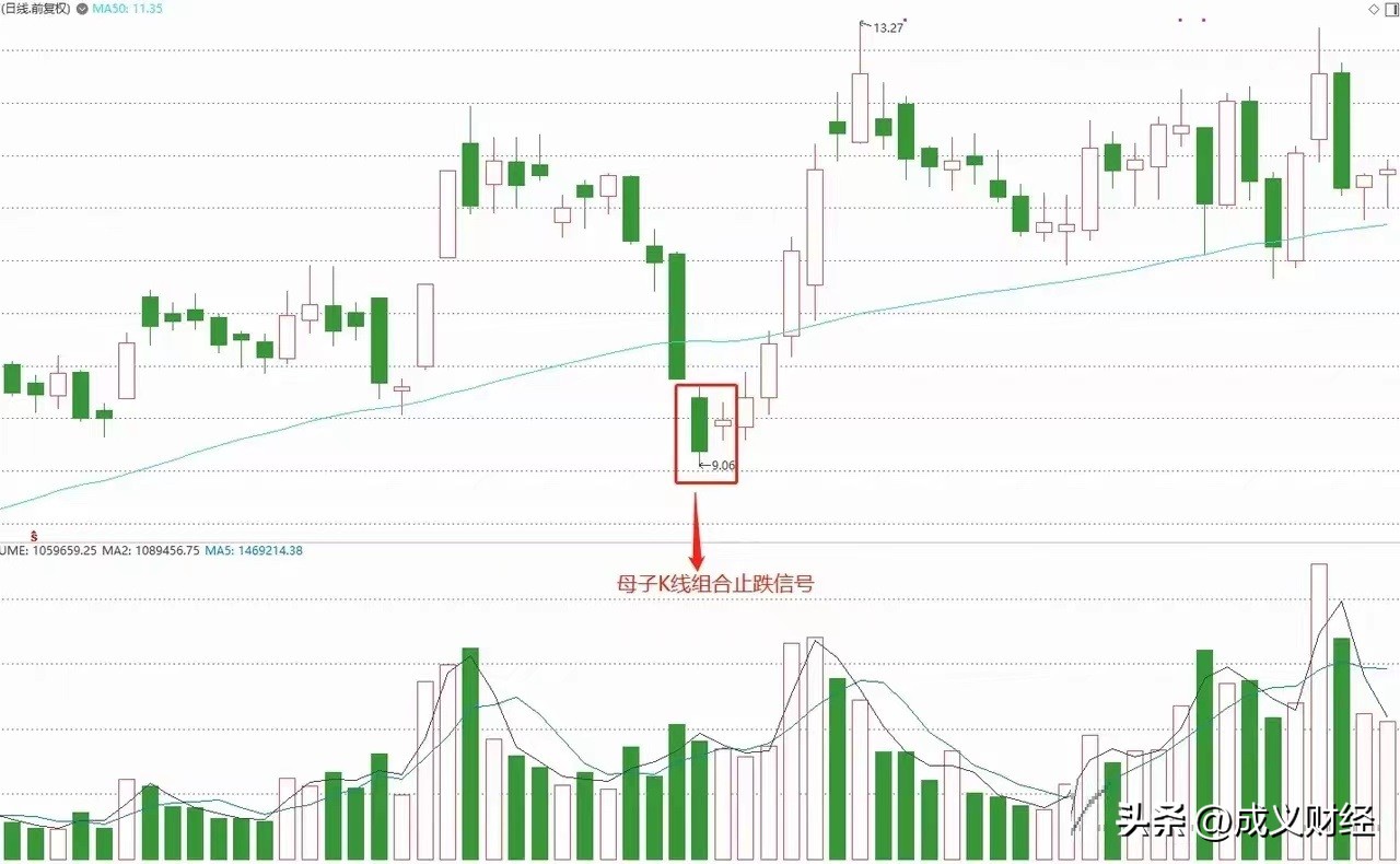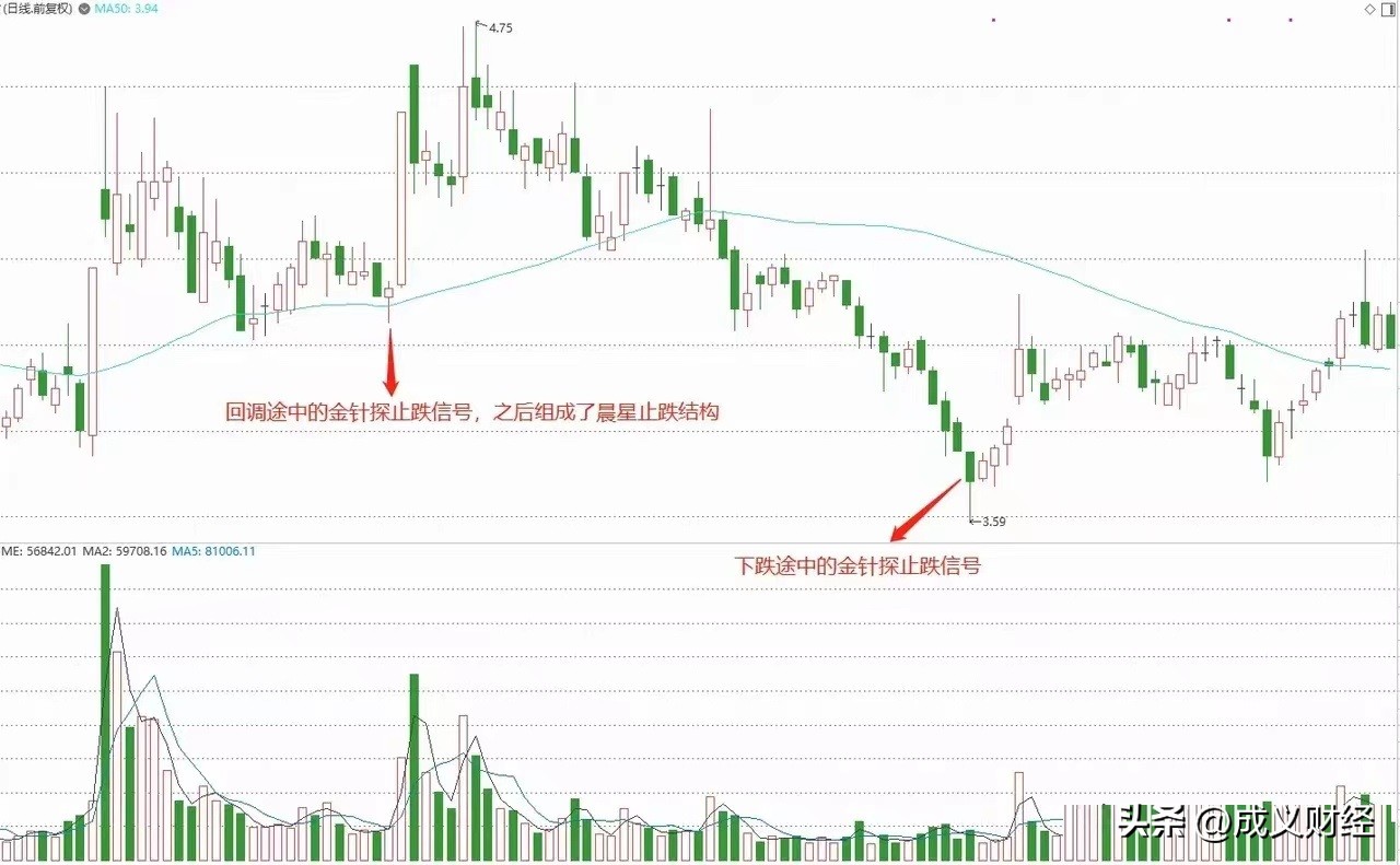 4.1、止跌信号,在股价回调的时候出现的,但是这个信号只是小反弹并非趋势反转,所以这个信号出现可以观察还不能介入。