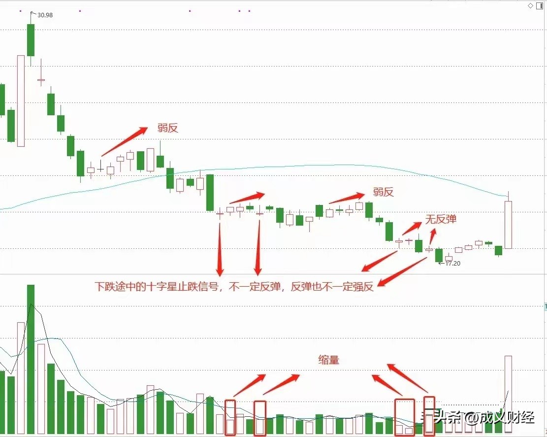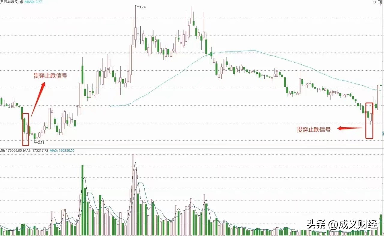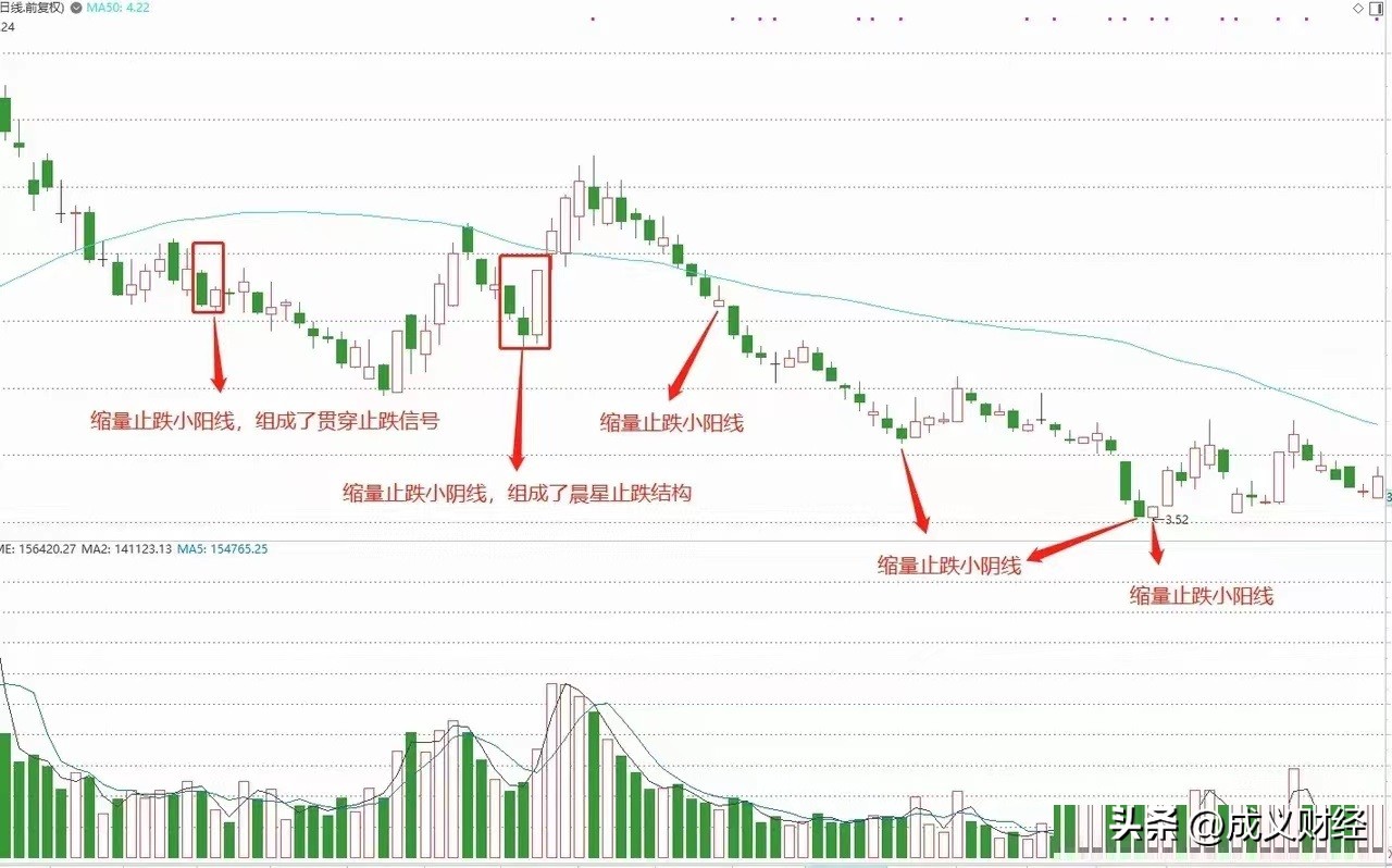 6.为了朋友们可以学会,在翻阅了近500个案例后,总结出5种常见的止跌信号,和4种止跌图形,成义用图片加文字的方式整理在下方,大家在复盘的时候多看看,悟透里面的精华,在以后炒股的路上必定先人一步。