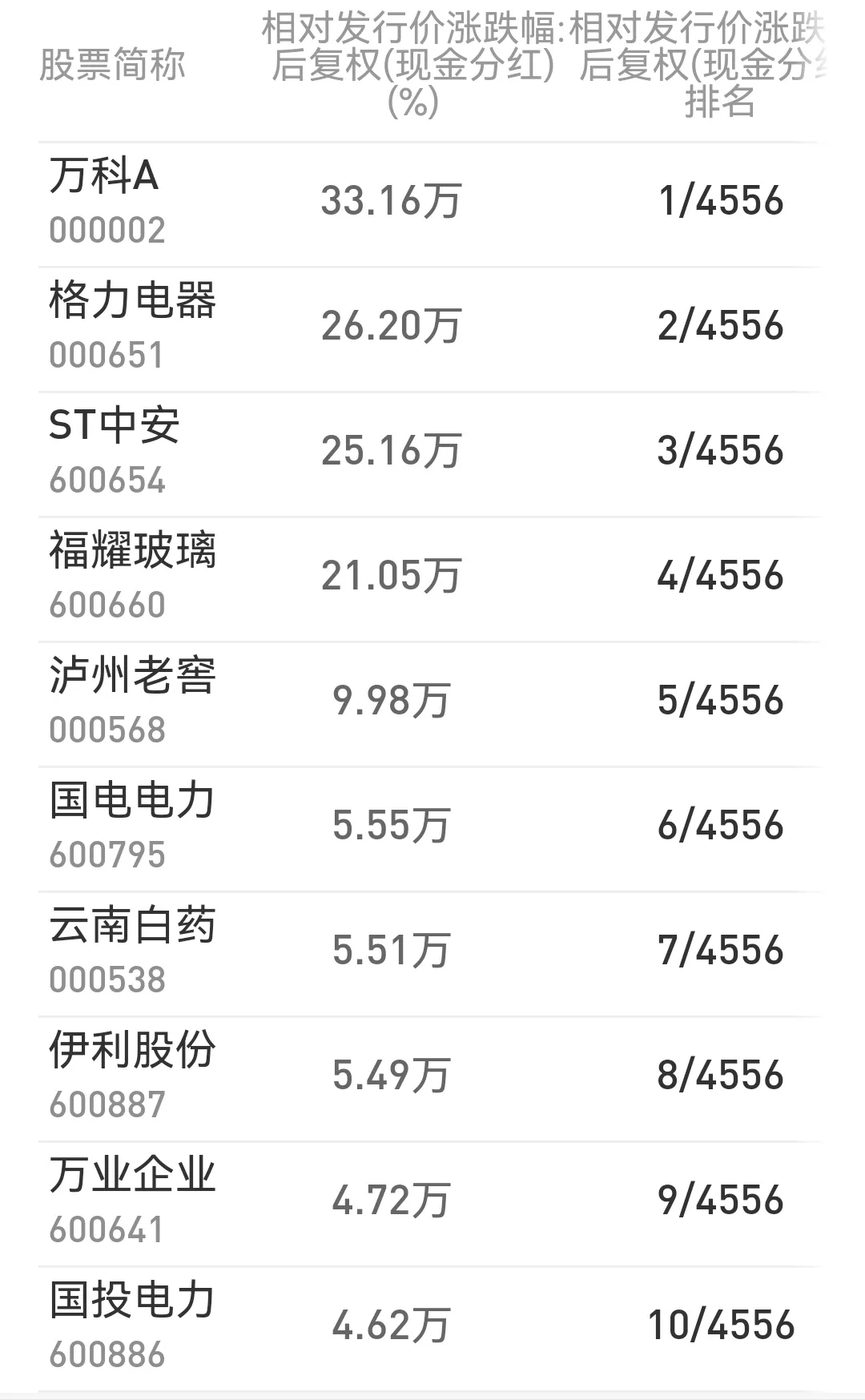 3.看到这里,大家是不是又开始相信价值投资了?第一名:万科 A 3316倍 1/4556第二名:格力电器 2620倍 2/4556第三名:ST 中安 2516倍 3/4556第四名:福耀玻璃 2105倍 4/4556第五名:泸州老窖 998倍 5/4556第六名:国电电力 555倍 6/4556第七名:云南白药 551倍 7/4556第八名:伊利股份 549倍 8/4556第九名:万业企业 472 倍 9/4556第十名:国投电力 462倍 10/4556