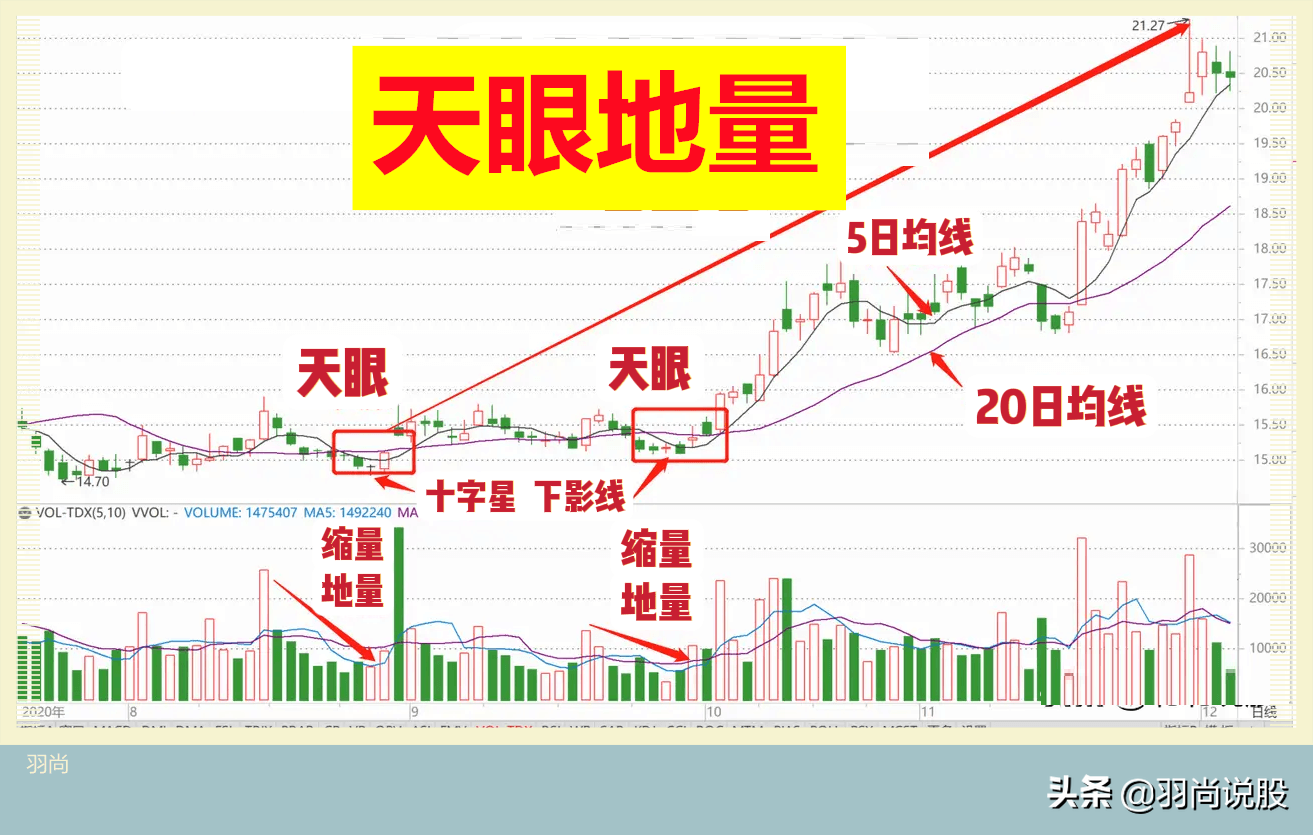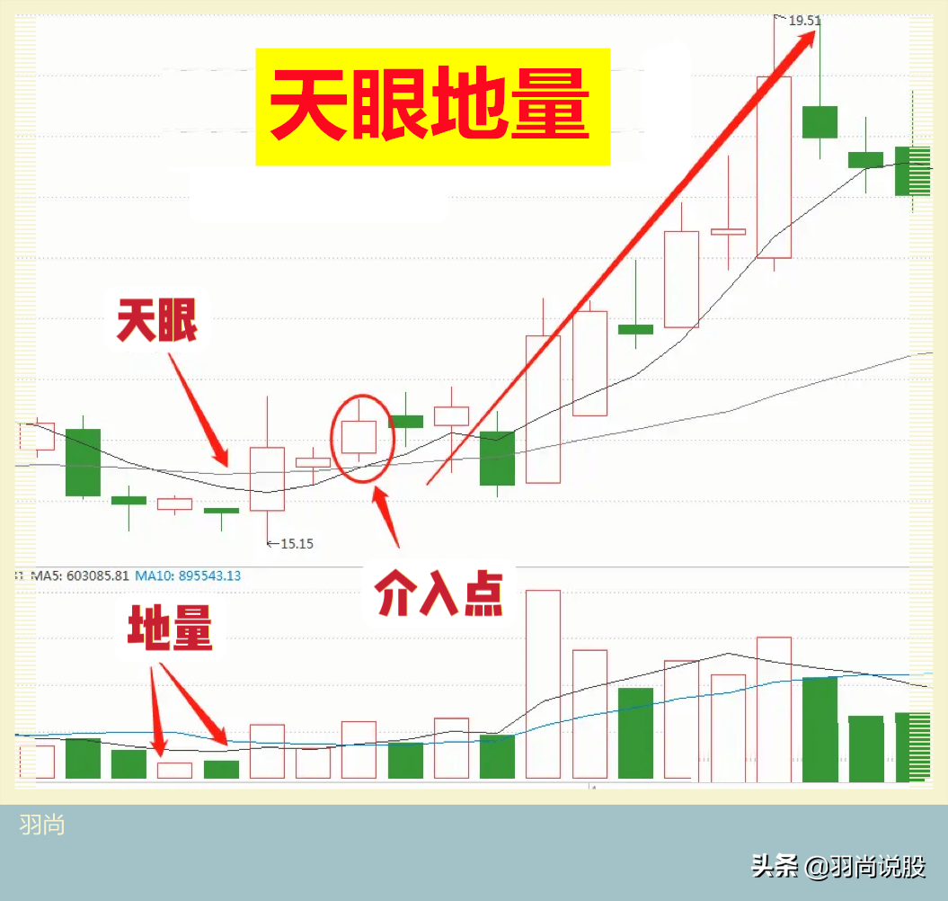 2.“天眼地量”指股价在低位,出现5日线跌破20日线后,再短期快速站上,形成三角形称为“天眼”,同时底部缩量,称为“地量”。