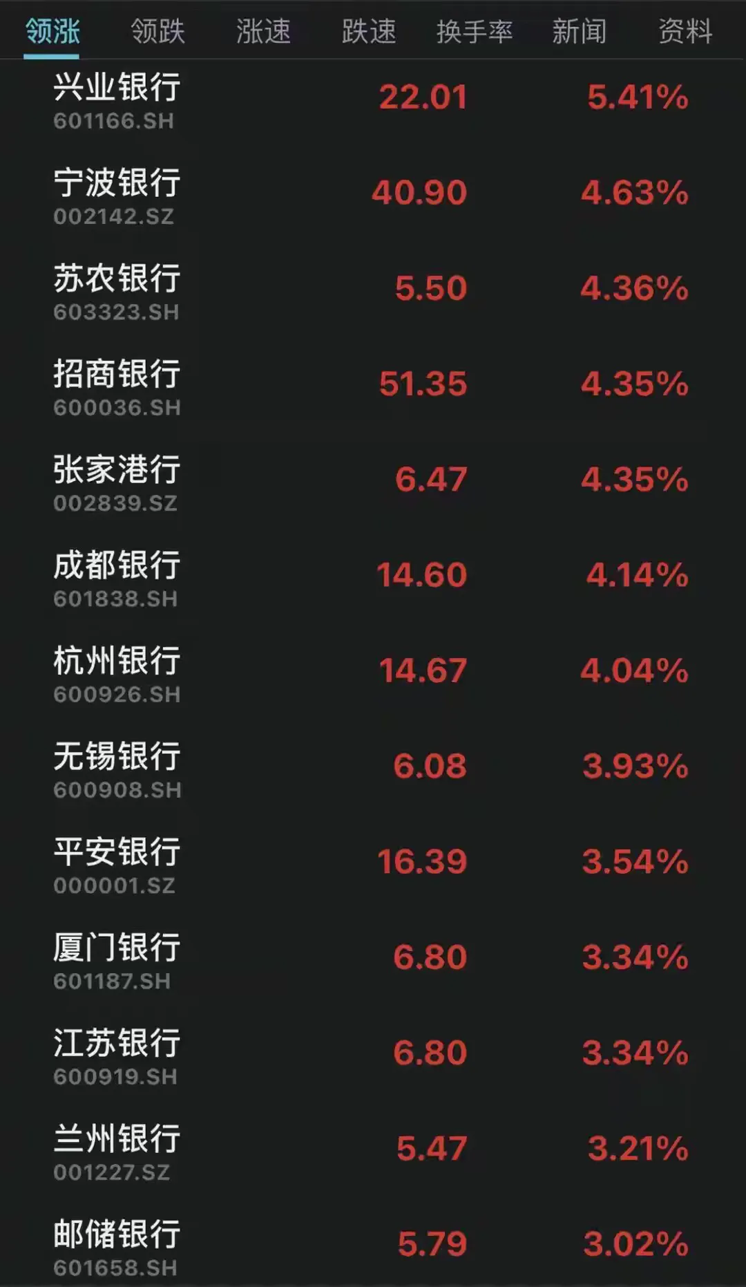 8.截至收盘,兴业银行涨超5%,宁波银行、苏农银行、张家港行、招商银行等10余只个股涨幅超过3%。