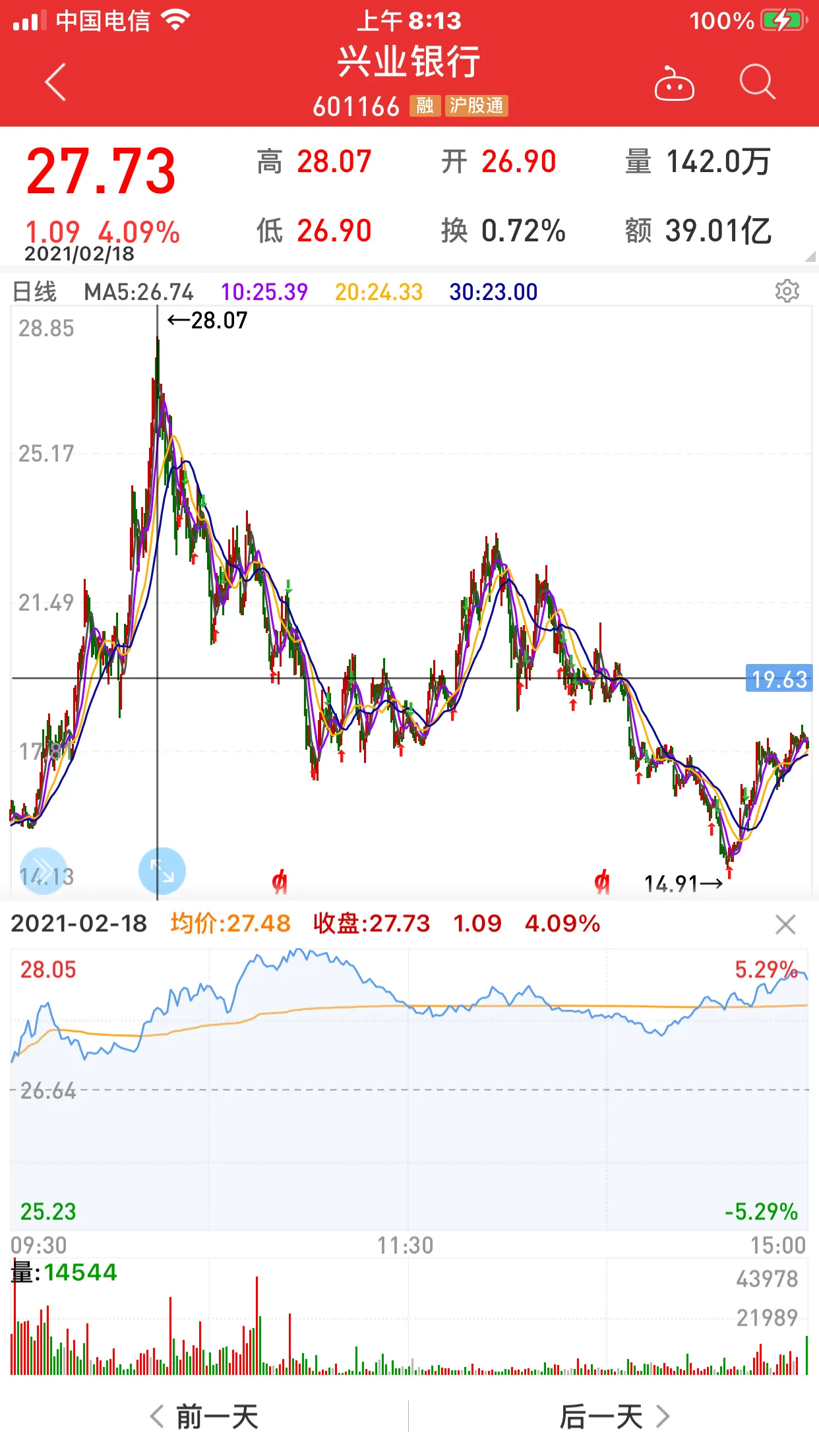 5.兴业银行一年内,股价从14元多到28元,公司基本面没有重大变化,资金推动吧!……………………………………………..2022年2月7日,是虎年的第一个交易日。