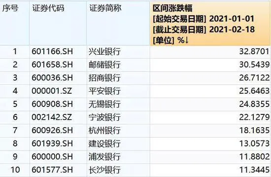 4.2021年初至牛年第一个交易日(2月18日),银行股表现较为强势,整个板块涨幅达14.91%,兴业银行、邮储银行、招商银行、平安银行的涨幅甚至超过了25%,兴业银行涨幅32.87%排在银行板块第一名。