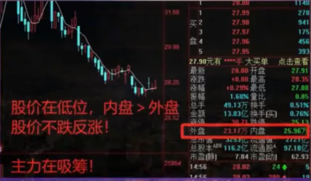 9.第四,内盘大于外盘,股价在低位,如果不跌反而上涨,那么主力大概率在吸筹(图四)。