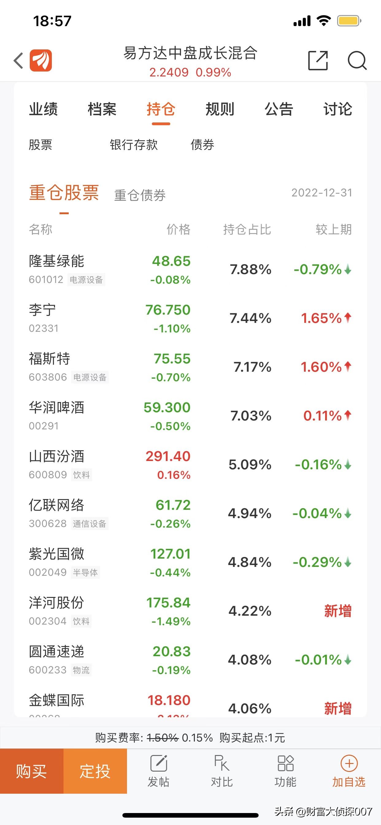 我们来看看2022年四季度末这个基金的持仓情况,主要有隆基绿能、李宁、福斯特、华润啤酒、山西汾酒、亿联网络和紫光国微这些票。看得出来消费板块比较多。