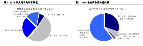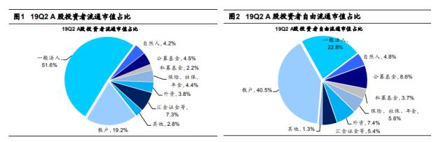 将养老金三大支柱与保险资金统称为保险类资金,规模合计 26.6 万元亿人民币,与名义 GDP 的比值约为 30%。目前我国保险类资金入市规模较小,截止 19Q2险资持股规模占 A 股流通市值的比重为 4.4%,占自由流通市值比重为 5.6%,自由流通市值口径下险资的占比低于公募的 8.6%与外资的 7.4%。(图2)