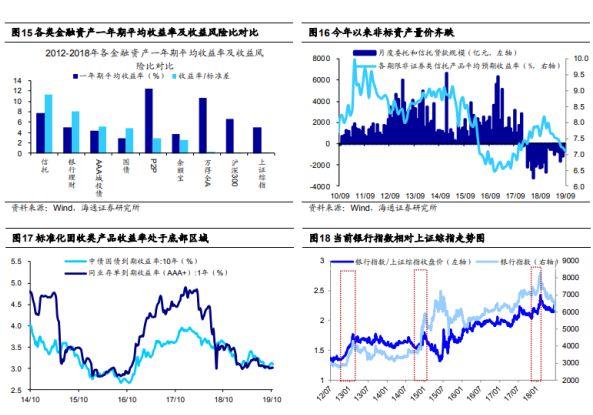 从收益率看,由于刚兑信仰逐步打破,代表非标收益率的非证券类信托产品平均年化收益率从 18 年底的8.2%逐步下降至当前的 7.2%,代表标准化债券的国债和同业存单由于是无风险资产而受到偏爱,十年期国债收益率从 18 年初最高的 4%下降至当前的3.1%,AAA+级同业存单一年期收益率从 4.8%下降至 3%。目前各家险资年化投资收益率的目标一般定在 6-10%左右,固收类资产收益率和可投资规模的下降会拖累整体的投资收益率,而当前 A 股估值处于历史中低位,截至 2019/10/18 全部 A 股 PE(TTM)为17.0倍,位于 2005 年以来从低到高 34%分位,PB(LF)为 1.68 倍,分位数为 7%,打破刚兑后权益资产的性价比上升,股票资产将是险资资产收益率另一个增长点。由于财政部规定保险公司要在 2021 年以前改为遵守 IFRS9 会计准则,新会计准则下原来用作调节利润的科目“持有到期类金融资产”取消,保险公司为了降低利润表的波动,预计将投资高股息个股,投资目的从交易变为分享分红,公允价值变动因此计入资产负债表而不影响利润表。截至 2019/10/18 市值前十大银行的 2019 预测股息率中位数为4.4%,近12 个月股息率中位数为 4.0%,而银行股整体估值仍然处于低位,中信银行指数的 PB(LF)只有 0.87倍,位于 05 年以来 7%的分位,银行股具备配臵吸引力。目前银行和地产低涨幅,低估值,低配臵,四季度或有异动。(图5)