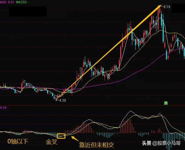 5.(如图4)5:金叉穿越0轴,然后两条线黏合,分离MACD指标在0轴下方,出现了金叉,股价开始上行,在穿越0轴之后,黄白线开始黏合在 一起,股价也出现了滞涨状态,黏合一段时间过后,黄白线开始分离,股价开始加速上行,形态完成。