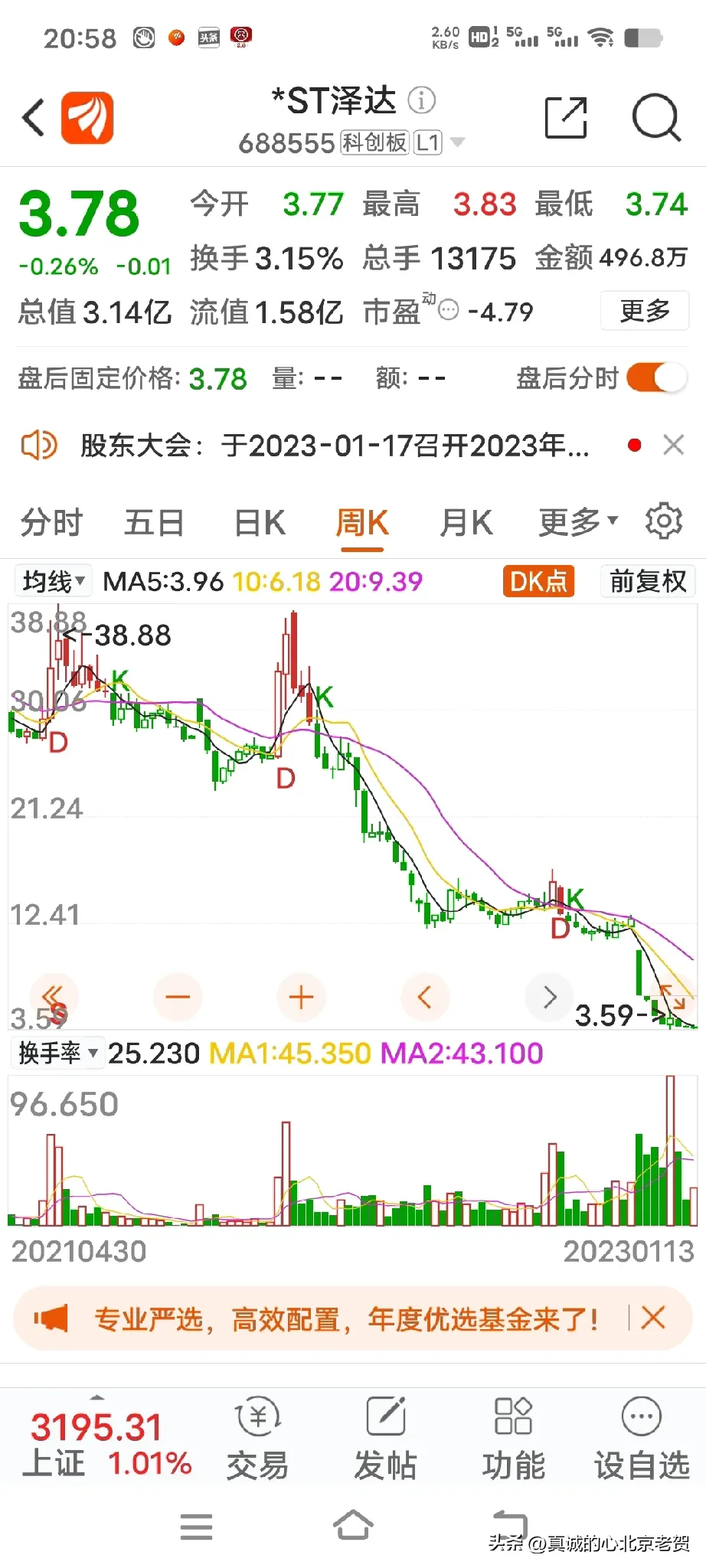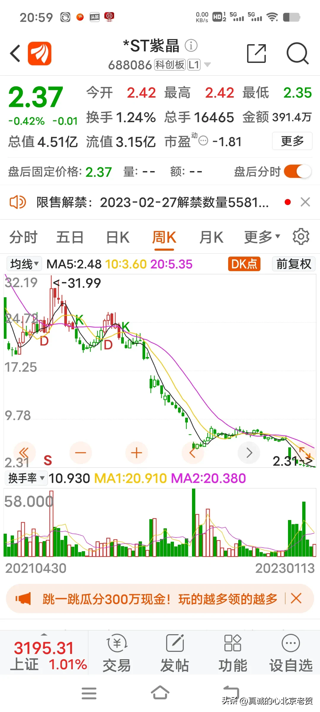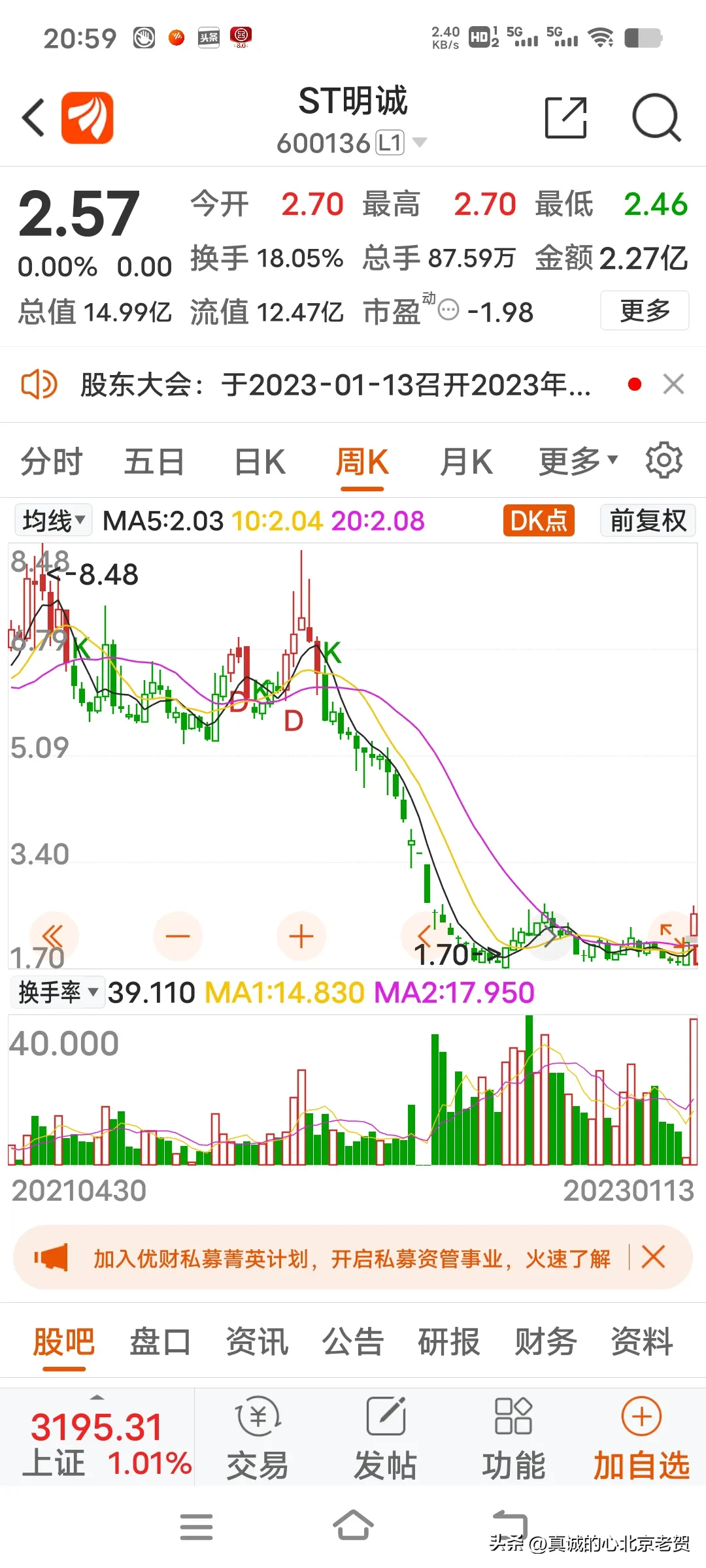 4.图中前两只股票,如果你在去年1月份买入,到年底你就赔了90%多,这两只股票还有被退市的风险,你说股市里有这么多只股票你不买,你偏得买两只垃圾股票,亏损严重的股票,用几十块钱买进垃圾股票,赔钱你不赖自己你赖谁?真的,有的人一生挣辛苦钱不容易,不舍得吃 不舍得穿,攒两个钱进入股市,但是被这个股市上了一生都忘不了的教育课,赔的一无所有,这样的人真的不赖别人赖自己,好日子不过,偏得自己把自己辛苦的挣的钱给别人,自己往火坑里去跳。