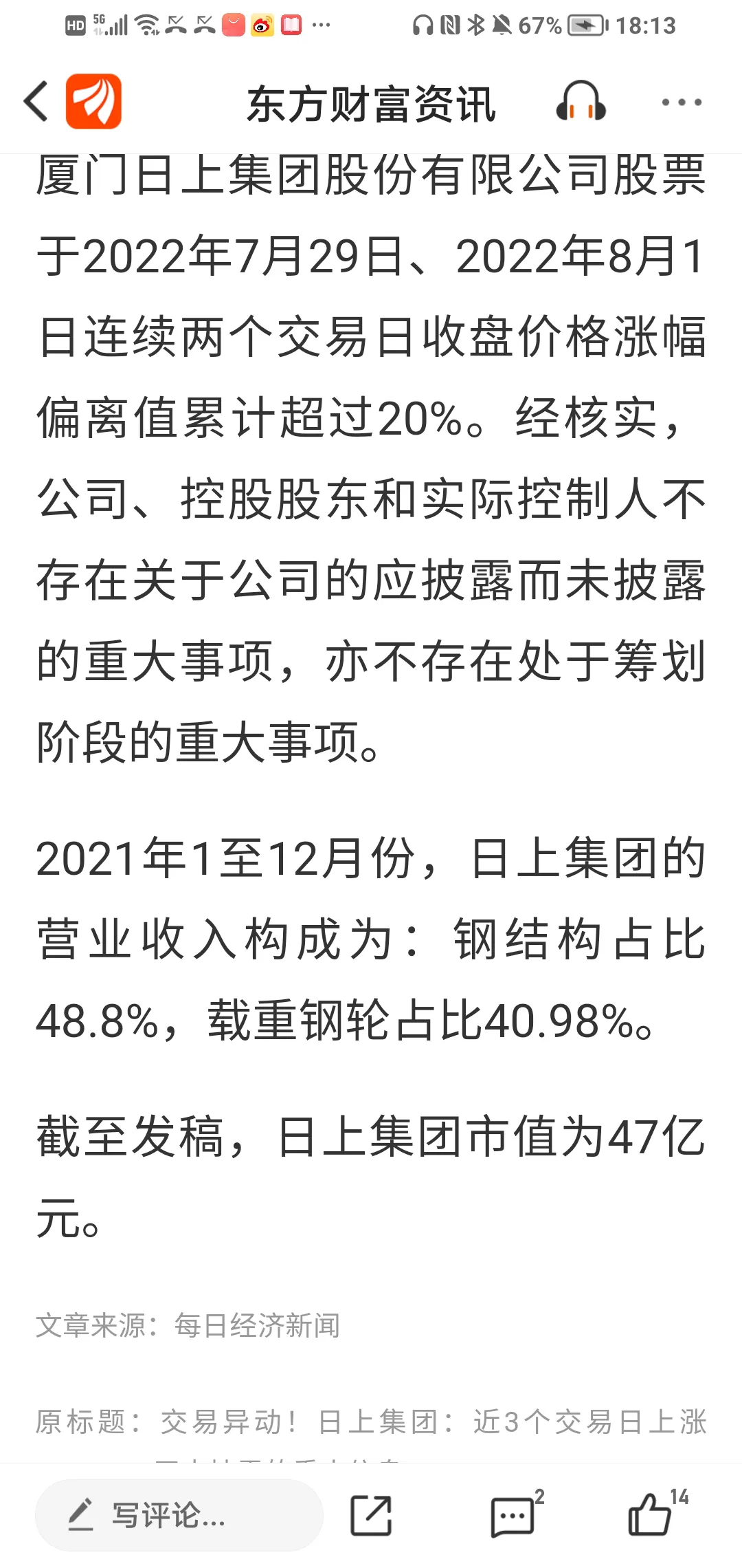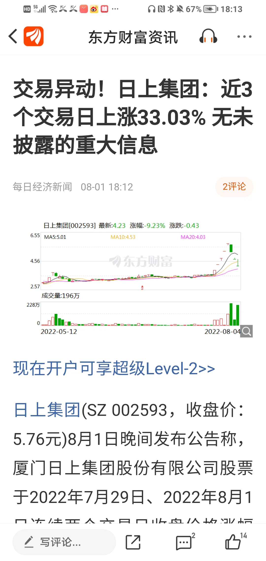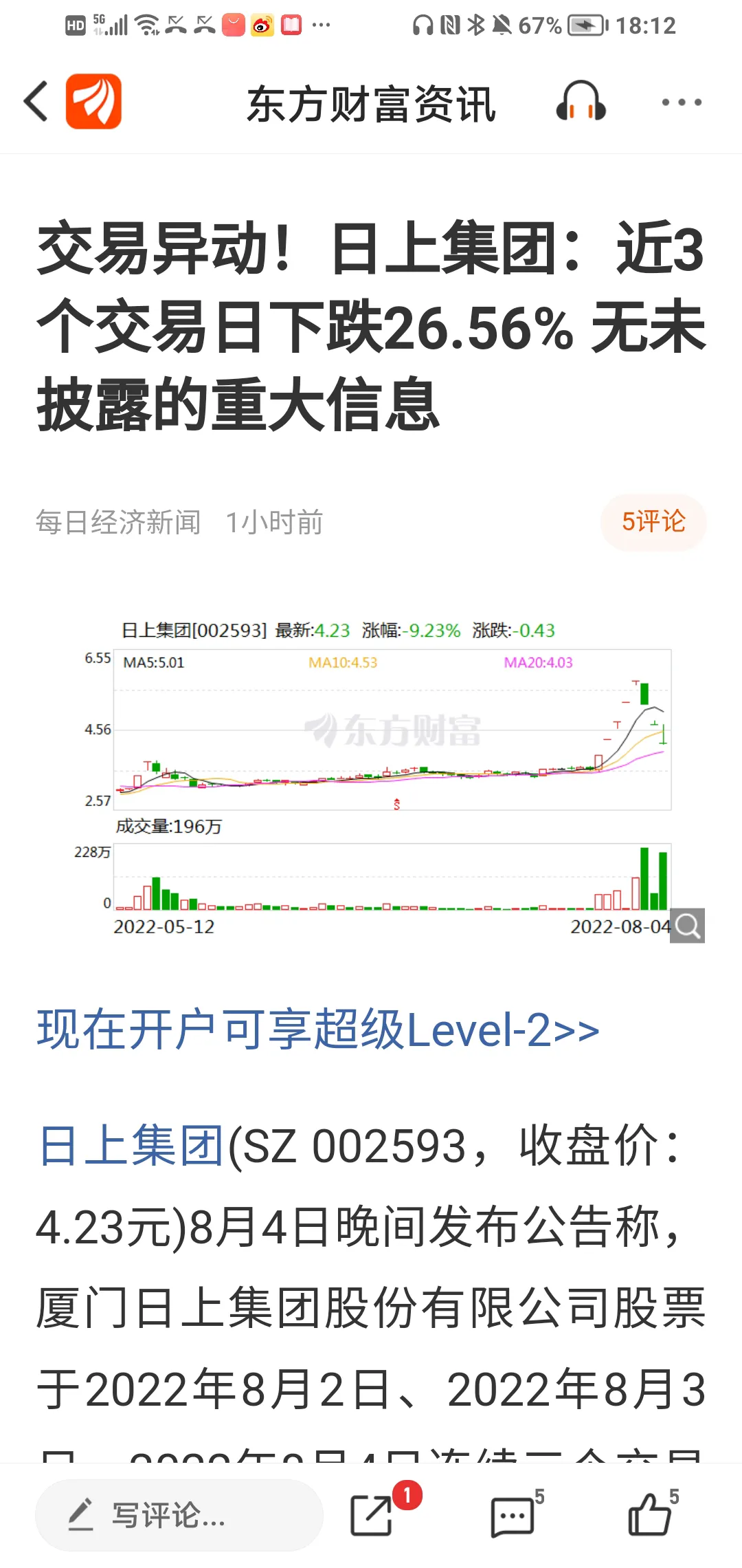 截止到8月1日,日上集团从6月25日收盘价3.58,短短5天5个涨停板(其中2个一子板)收盘价高达5.76,5天升值高达60.89%,理论上,7月25日持有该股并坚定不移不出者,5个交易日收益达60.89%,堪称A股同期第一牛逼股。