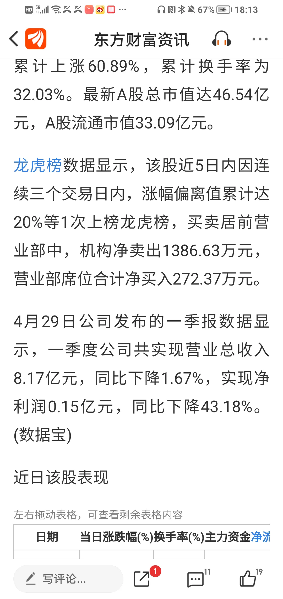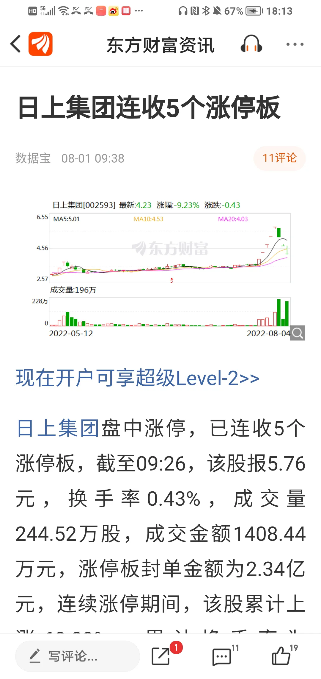 第二天,7月27日一字马全天封死涨停板,收盘价4.33元,换手率9.29%。
