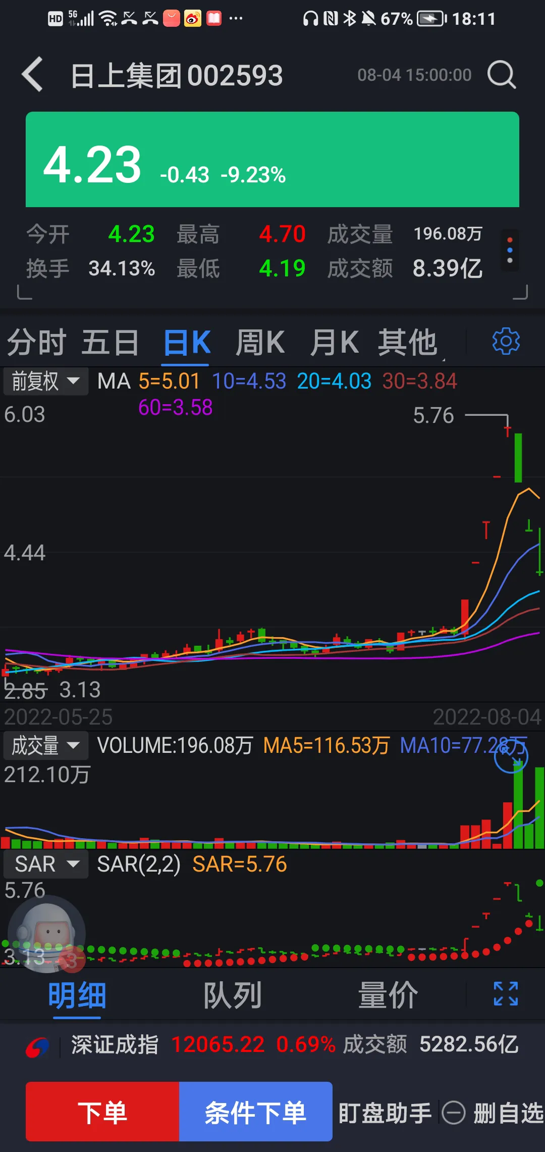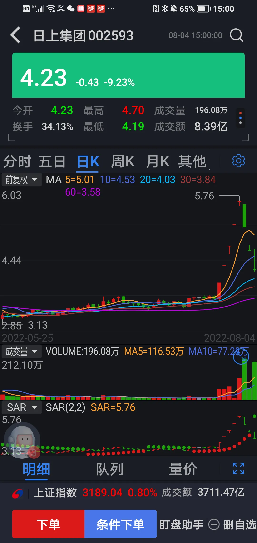 第八天,8月4日(今天)日上的恶梦仍然在继续,今天第三次:开盘和盘中反复封死跌停板,虽然说一度还翻红,最高5.70,比咋天收盘5.66高,但收盘又被砸至4.23,离第三个跌停板仅仅4分钱,关键是换手率再放巨量达34.13%,除极个别T加0超级高手有跌停板上手在短暂翻红时拼出10个点差价外,95%以上早一天介入者再次全部套牢。