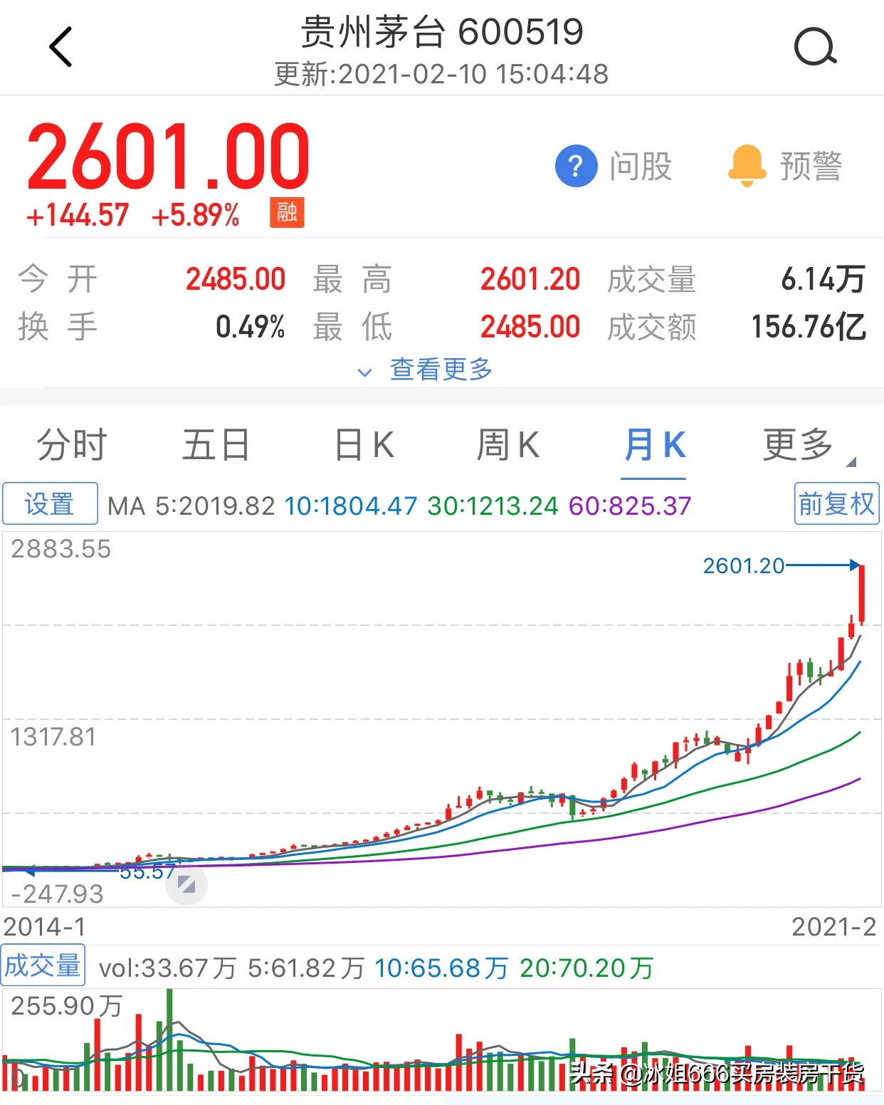 4.但是,近30万市值一手的茅台股票,明显已经不是小散们“随心可欲”就能参加的游戏……散户炒股易被当韭菜,百姓投资炒房易被套!如今百姓投资炒房,和散户投资炒股,有多少的相似之处呢?[机智]无论房产价值大小,百姓刚需入住新家,喜笑颜开……1499元一瓶的茅台,大年三十登上百姓餐桌加入团年晚宴,皆大欢喜……但是,茅台股票涨得再好,不再是适合小散参与的游戏了!过去房价一路上涨,买房就是赚;而今房价涨跌分化,不赚就是亏……据数据宝数据,2021年1月深圳房价突破9万,同比上涨37.68%……深圳房价,看上去跟“红得发紫”的茅台股,多么的“同工异曲”……但是,2月8日深圳“二手房成交价格参考机制”出台,3595个小区参考价格出炉,中介平台3万余套在售房源的房价“暂无数据”了!一记响雷之后,一夜之间,无论是深圳上亿的豪宅,还是几百万的老破小,大家都是“一个模样”了!过去的茅台,感谢持续“横盘”的楼市,加速了资本聚集,从而成就了茅台的“飞天”之路。