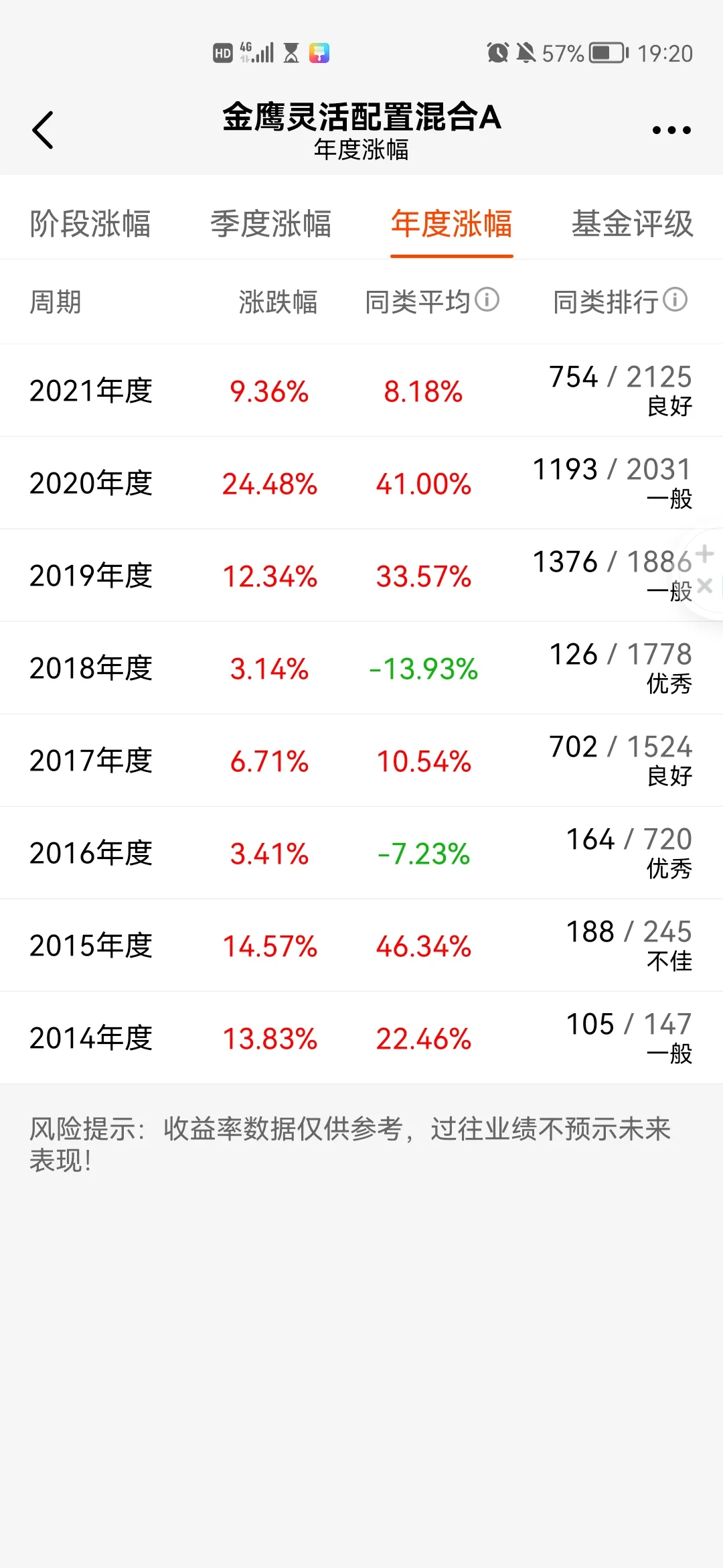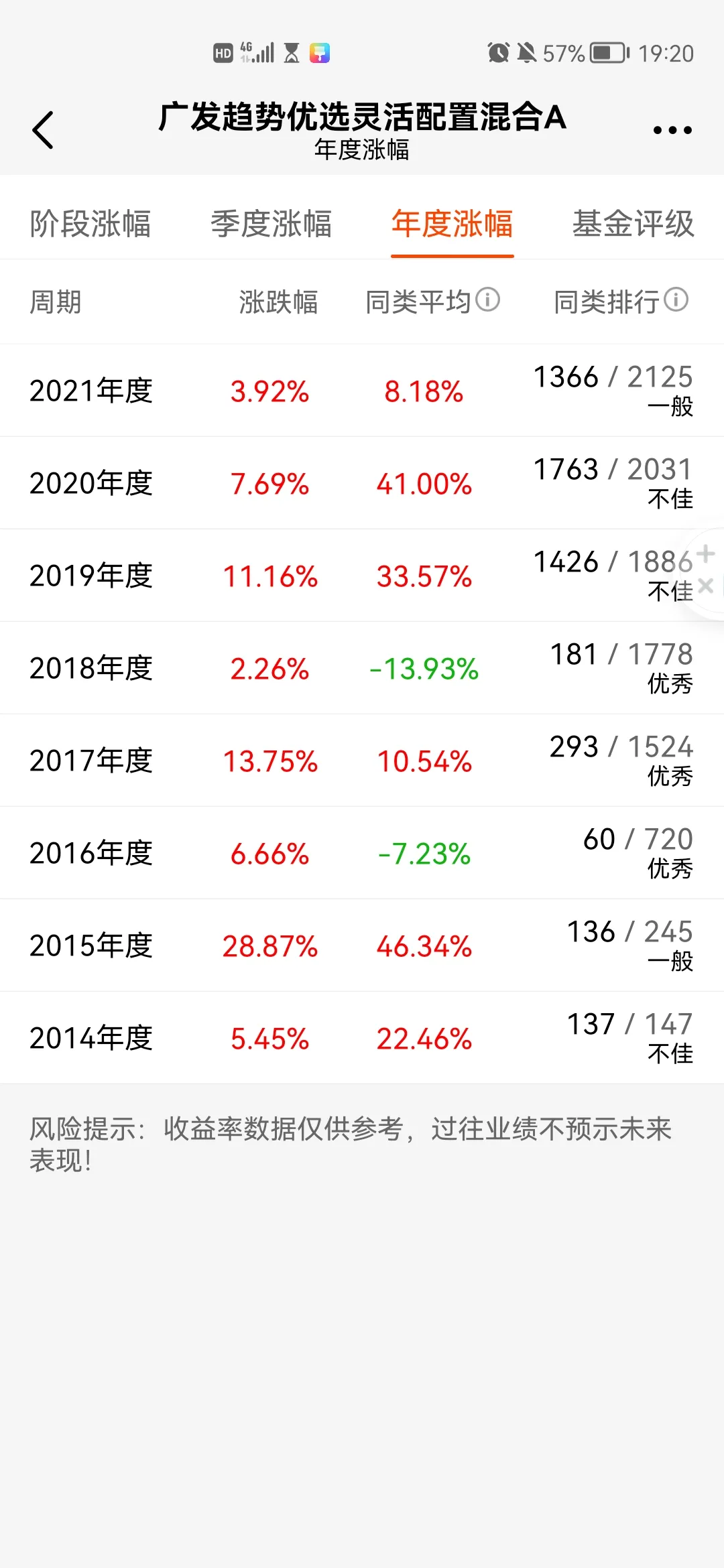 8.广发趋势优选灵活配置混合A/C2013年9月成立,这只基金也很稳定,近八年收益都是正收益,但是其收益率却偏低了,近三年收益率21.37%,同类84.93%。