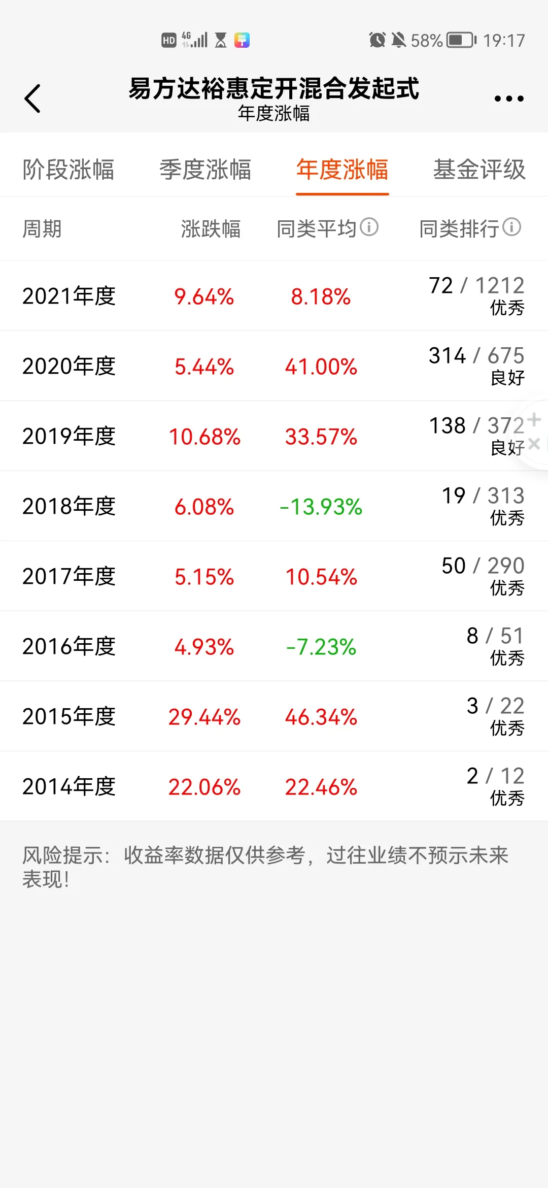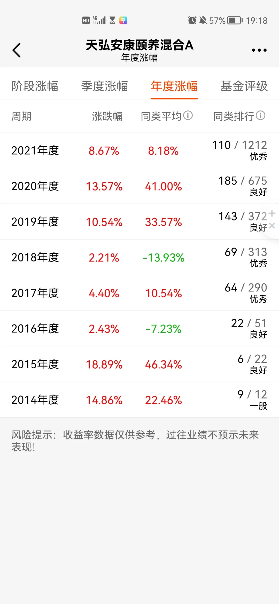 4.这只基金近五年最大回撤是17.65%,近三年最大回撤是15.67%,近一年最大回撤是12.53%,2014年至2021年都是正收益。