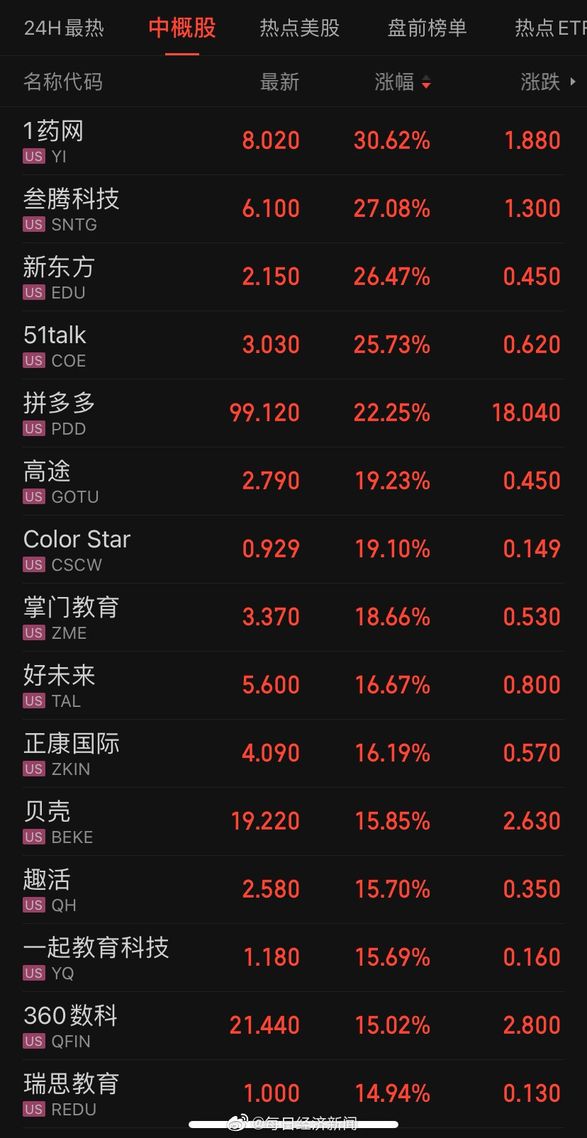 4.在美股大盘走高之际,多数热门中概股继续跑赢大盘,加速上涨,新近公布财报的拼多多领衔,掀起高涨的势头。