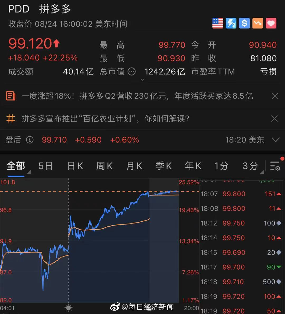 6.个股中,拼多多跳空高开逾12%,午盘涨幅一度达23%,收涨逾22%,自7月22日以来首次收盘涨破99美元。
