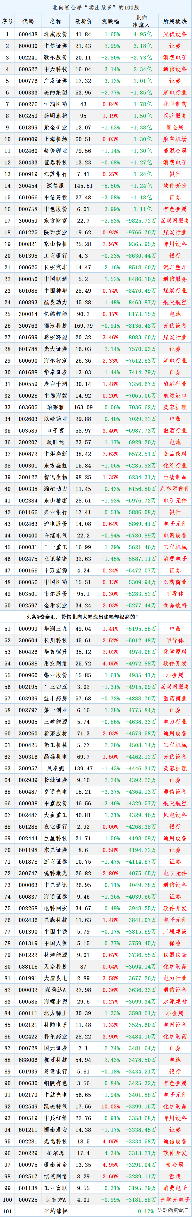 具体流出清单如下(北向资金大幅流入的见另外一篇):