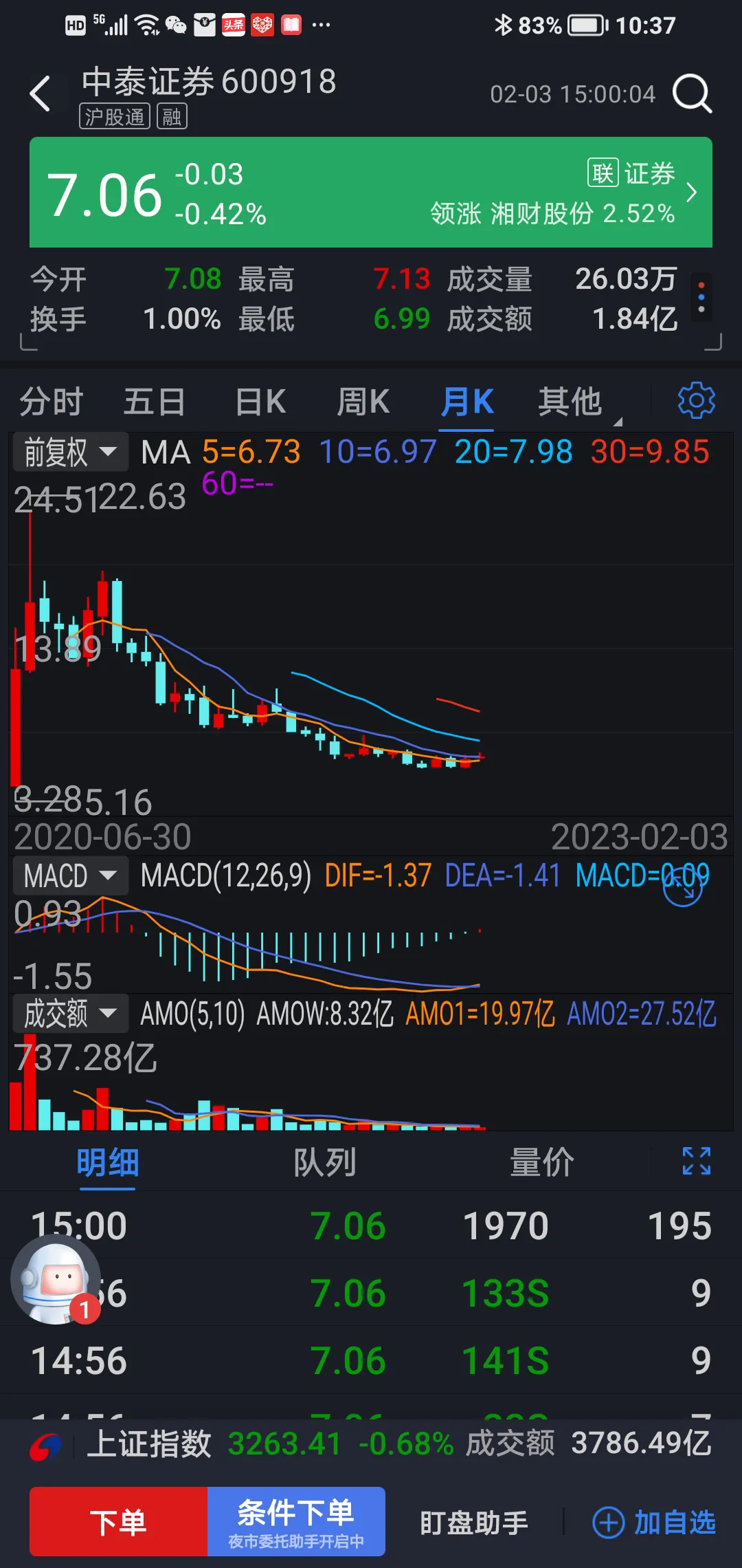 四,财达证券,2021年5月上市,发行价才3.76元。但开市仍然是11个一字马涨停板,虽然说又赶上7月大盘券商股大涨,但太拉圾最高也就见18.83历史性高点,而后越跌越低,反弹一次总会再创更低,最新价8.62元,比高点18.83跌了54%,等于高处买入一百万今天成46万了。