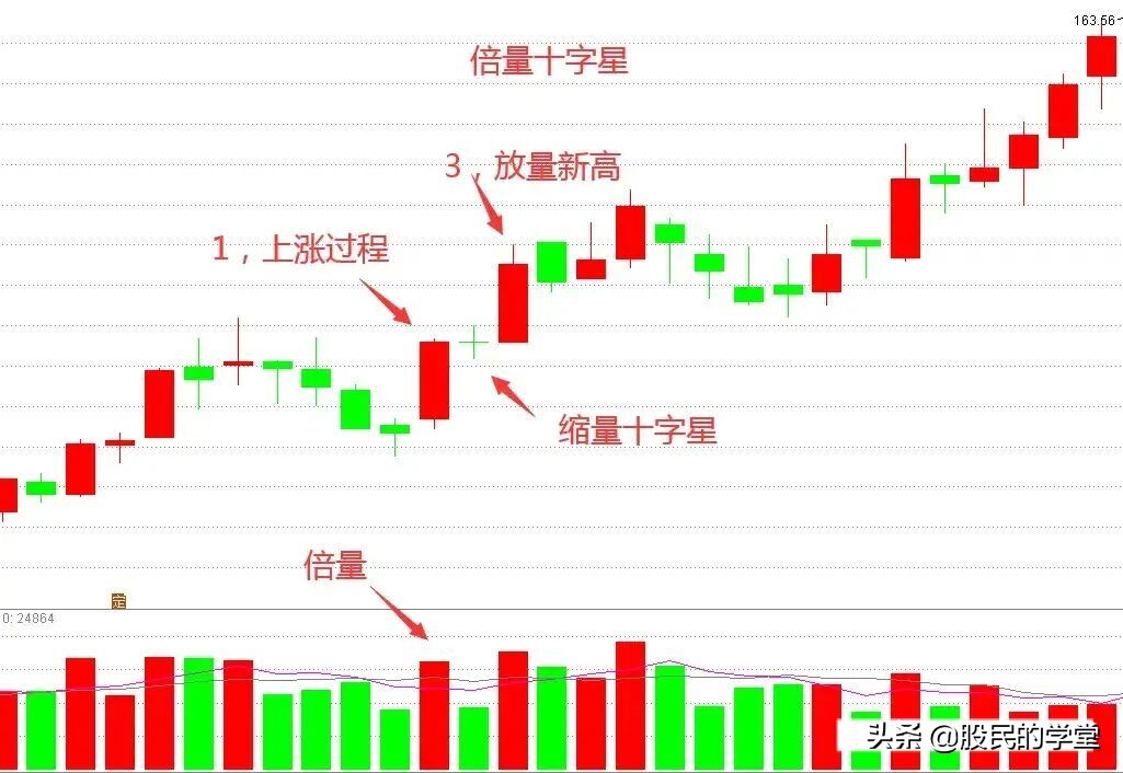 3.2、十字星出现之前,要出现倍量阳线,说明行情往上,资金做多意愿强。