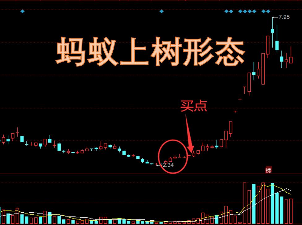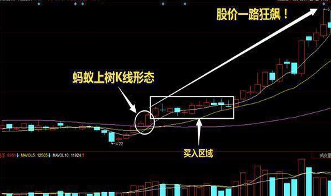 股价经过长期下跌或相对低位,在底部企稳,连续走出五根小阳线,成交量也温和放大,那就是蚂蚁上树形态。