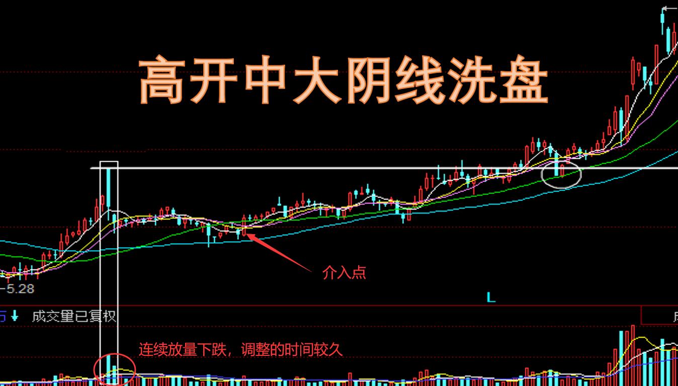 1、股价处于刚脱离底部区域,还处于洗盘阶段,并且是小高点出现高开中大阴线;