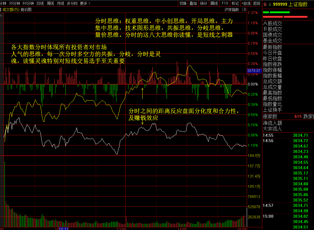 6.1、分时结构是灵魂,反映各投资者对当天市场的思维,大盘涨跌不是单一主力行为,他牵动着所有投资方对市场的最终集合体,与个股的分时载体而不同,个股的主力具有单一性或多重性,大盘的分时资金是集体性,一旦确认上涨或下跌有着稳定的持续性。