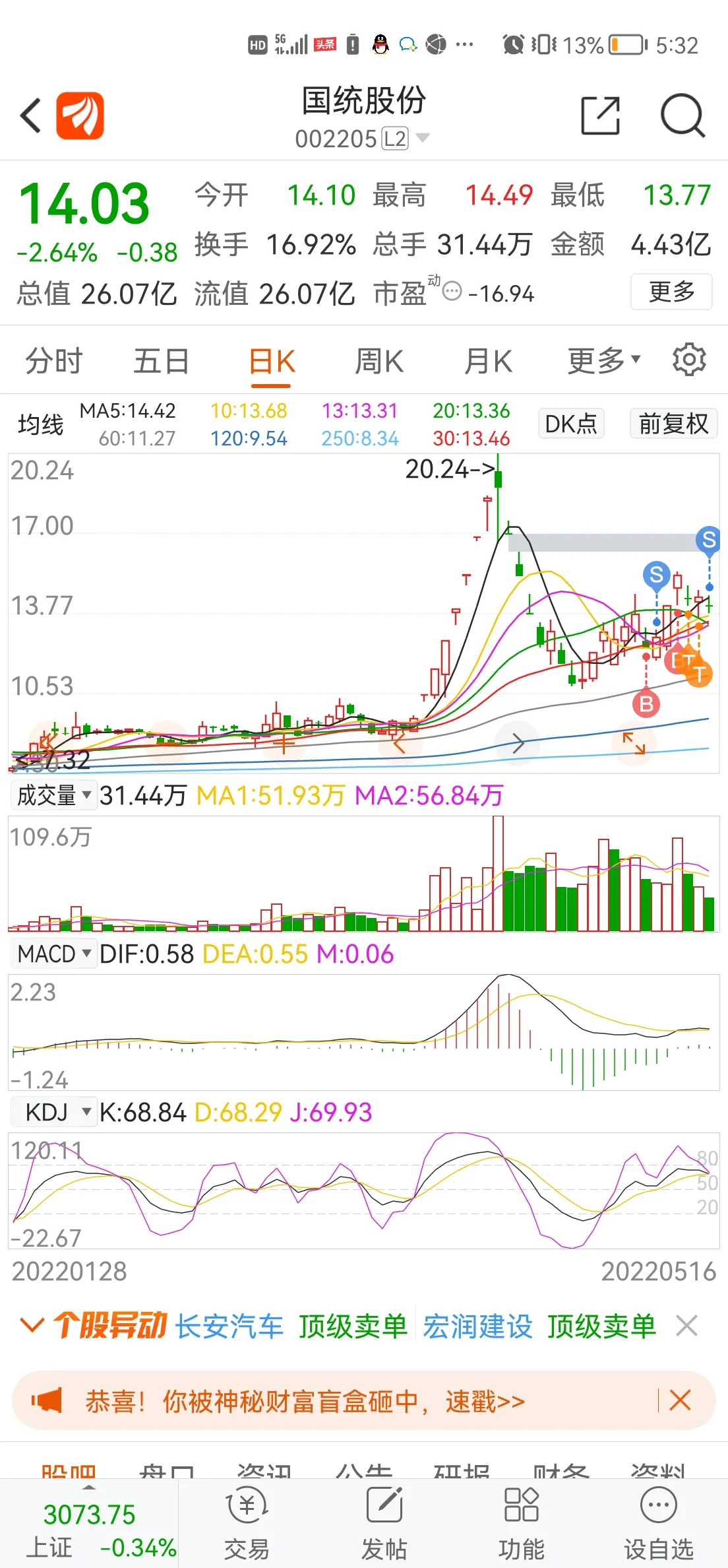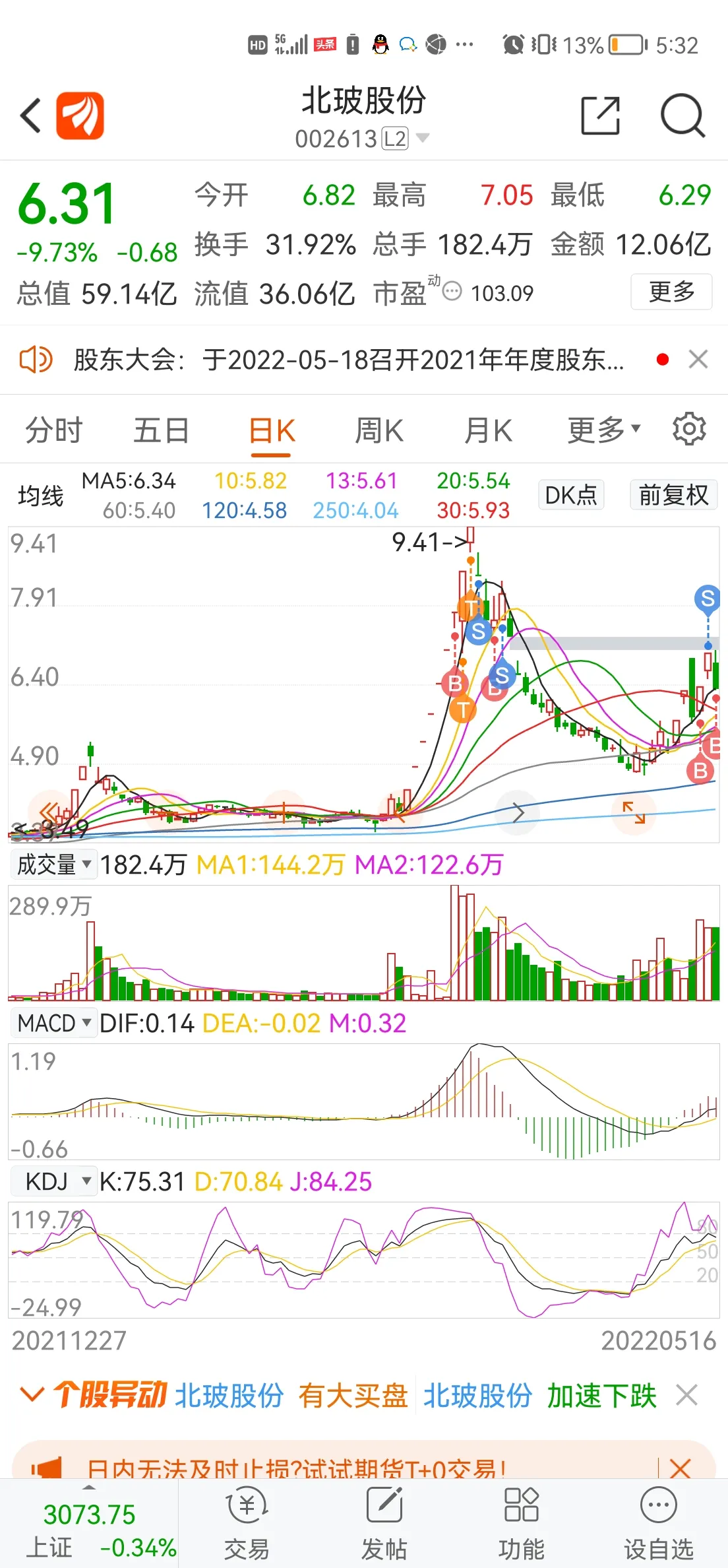1.5月16日妖股实操复盘:重仓买入收小地天板直接上干货分享:1、北玻股份:北玻上周五涨停附近卖出,后面没有买回回封了,今天没有溢价有点意料之外,早盘低开低走,回到上周五低点位置,坑主买回了一成仓位,两波拉升上去,尾盘放量接近跌停,补了缺口,回到五天线位置!明日策略:破五天线半小时不收回止损,五天线上持有!2、湖北广电:机构风格,进三退二,最近两个板都是开板,今天量能接近上一个板附近,但今天尾盘封住,最近消息面5g、元宇宙风向趋暖,坑主继续持有。