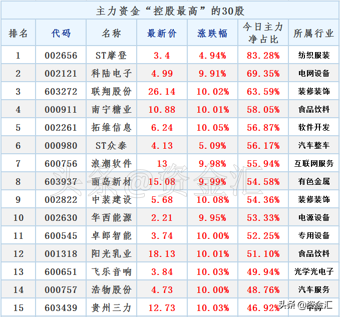 1.大数据! 今日主力资金“控股”最高的30股,名单来了更新日期:25日收盘。