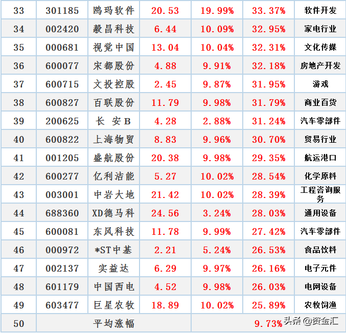 2.1 002656 ST摩登2 002121 科陆电子3 603272 联翔股份4 000911 南宁糖业5 002261 拓维信息6 000980 ST众泰7 600756 浪潮软件8 603937 丽岛新材9 002822 中装建设10 002630 华西能源11 600545 卓郎智能12 001318 阳光乳业13 600651 飞乐音响14 000757 浩物股份15 603439 贵州三力16 002660 茂硕电源17 002905 金逸影视18 002790 瑞尔特19 600190 锦州港20 000025 特 力A21 002227 奥 特 迅22 002605 姚记科技23 200413 东旭B24 600693 东百集团25 600805 悦达投资26 001212 中旗新材27 002589 瑞康医药28 000791 甘肃电投29 002606 大连电瓷30 000404 长虹华意31 300220 金运激光32 002334 英威腾33 301185 鸥玛软件34 002420 毅昌科技35 000681 视觉中国36 600077 宋都股份37 600715 文投控股38 600827 百联股份39 200625 长 安B40 600822 上海物贸41 001205 盛航股份42 600277 亿利洁能43 003001 中岩大地44 688360 XD德马科45 600081 东风科技46 000972 *ST中基47 002137 实益达48 601179 中国西电49 603477 巨星农牧点赞,是莫大的支持!